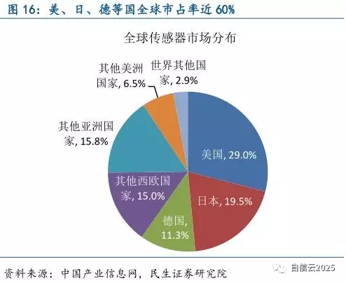 根据《装备制造》数据,2015年全球市场约1770亿美元,预计在未来五年内,全球所有的传感器领域的复合年增长率都将超过15%,2015年我国传感器销售额突破1300亿元,但95%以上均为进口配套形成。