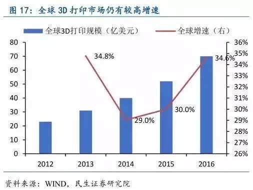 3D打印市场规模保持高速增长。Gartner发布的数据显示,2016年全球3D打印市场规模为70亿美元,至2020年将达到212亿,未来五年复合增速为32%。尽管增长显著,但事实上3D仅占到全球制造业市场的0.04%,市场潜力还未完全开发。