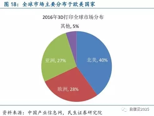 目前全球市场主要分布于欧美国家(市场占比超60%),竞争格局也相对集中,其中Stratasys、3DSystems和EOS三家3D设备制造商市场份额占到整个3D打印市场的70%,3D打印服务商也是Materialise和ProtoLabs两家独大,市场份额占10%。