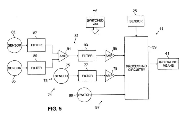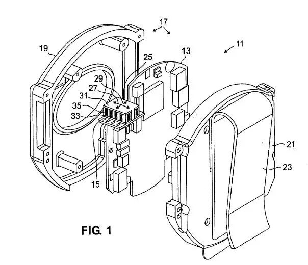 涉案的是一个名为“一个运用于评估身体运动的通信设备的系统及方法”的专利。这个系统包括一个传感器、一个处理器,和一个可以传送状态及容差标记给监控器的信号设备。iLife公司将这一技术用于一种防止老人跌倒和小孩猝死的监控设备之中。图一(FIG. 1)是专利文件中给出的一个实施例。图五(FIG. 5)是可能运用该专利的替代感应设备的原理框图。