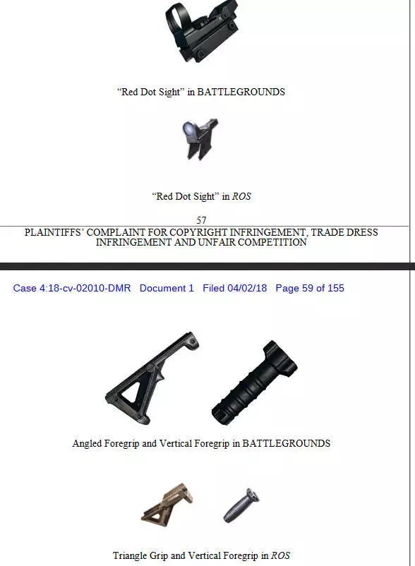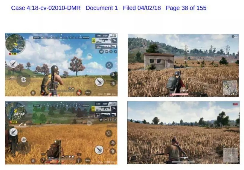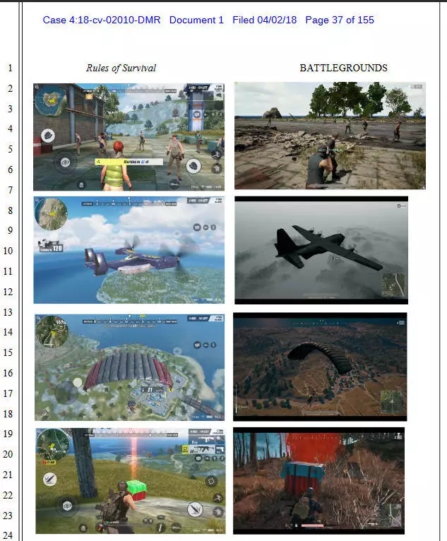 在长达115页的起诉状中,蓝洞用网易的两款海外产品《Knives Out(荒野行动)》和《Rules of Survival》与其研发的《绝地求生》进行细致对比,在玩法模式、建模设计、美术风格等方面提出侵权证据。