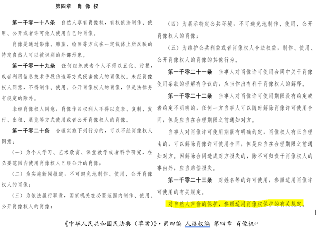 《民法典(草案)》确立了自然人声音参照肖像权?;さ脑?#xff0c;声音权确立为新型人格权和商品化权,有对世排他效力,模仿其声音牟利侵权可得救济,但权利行使亦充满限制