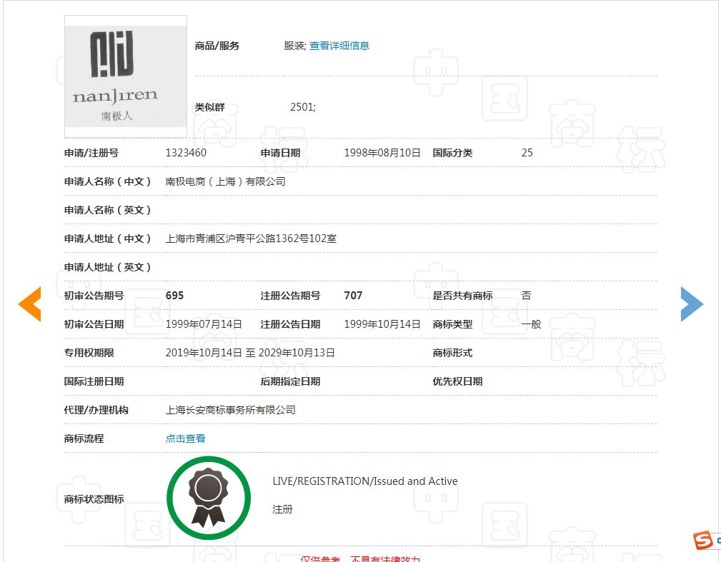 其中第一件南极人商标申请于1998年8月10日,目前核准使用在第25类服装。