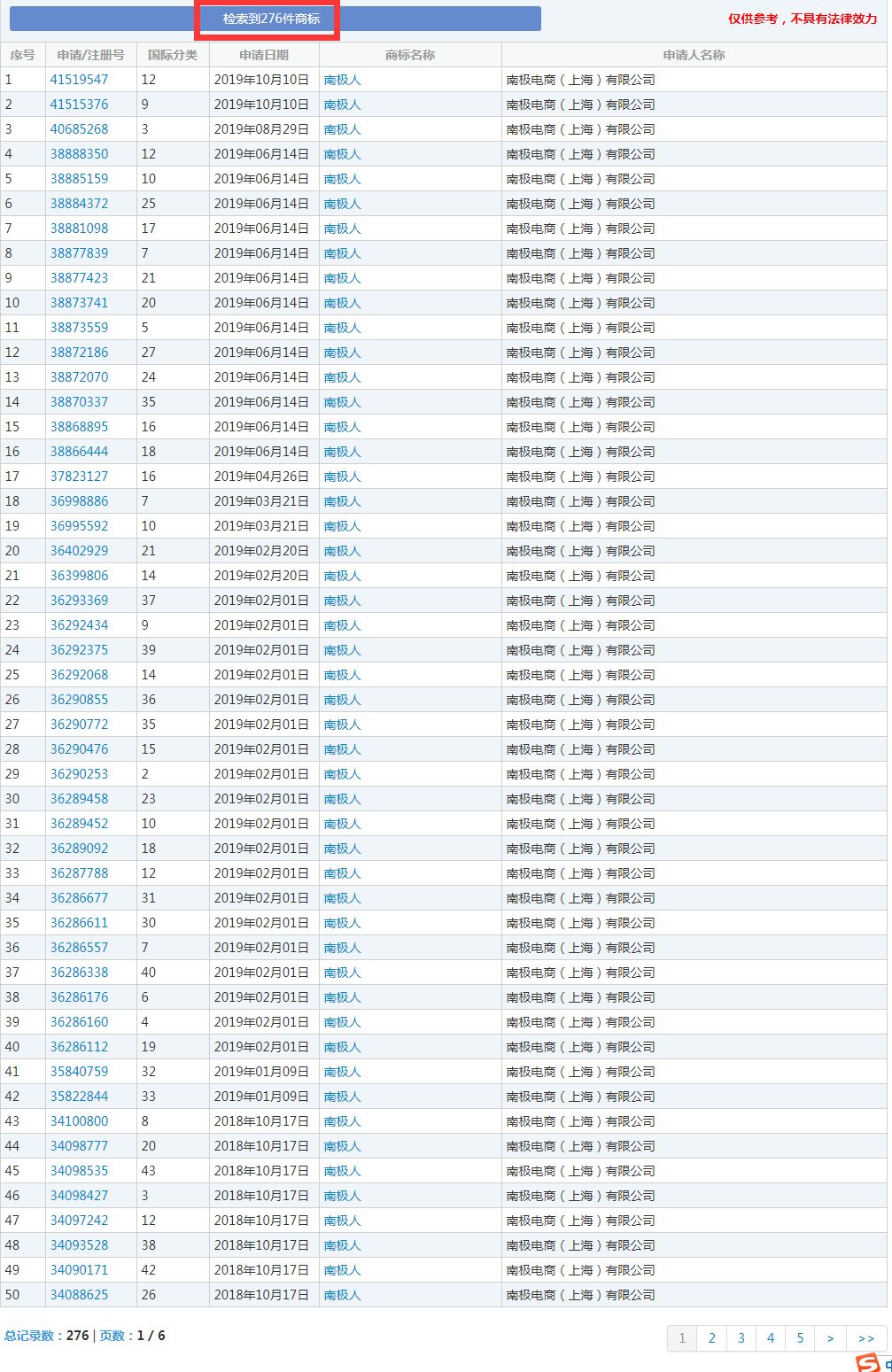 而南极电商共申请了包含“南极人”字样的申请商标276件。
