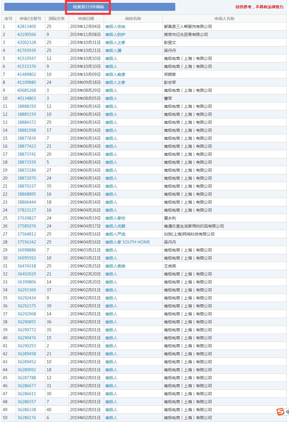 商标局网站查询得知,目前含有“南极人”字样的申请商标共有333件;