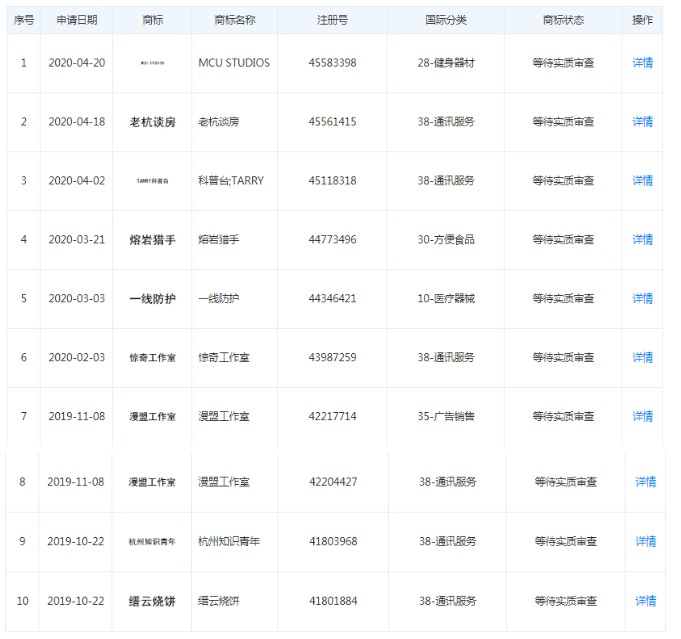 值得一提的是,中国商标网信息显示,该公司注册了多件与漫威相关的商标,目前这些商标的状态为:第28类“MCU STUDIOS”、第38类“惊奇工作室”、第35类“凯文费奇”、第28类“漫威旗舰店”处于待审查状态;第35类“漫威影业”处于已无效状态;第38类“漫威”处于已注册状态,但于2020年3月被提起无效申请。