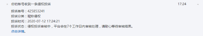 公号主称,7月12日下午5点24分,公号后台突然收到一条“侵权通知”。