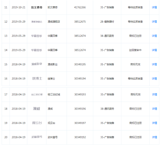 小编通过中国商标网进行检索,发现美漫网络共申请注册20件商标,其中仅4件商标获准注册,分别是第35类的“武林壹号”商标、第35类的“观云台”商标、第38类的“漫威”商标以及第38类的“华夏四季”商标,其他商标处于被驳回或等待实质审查阶段。