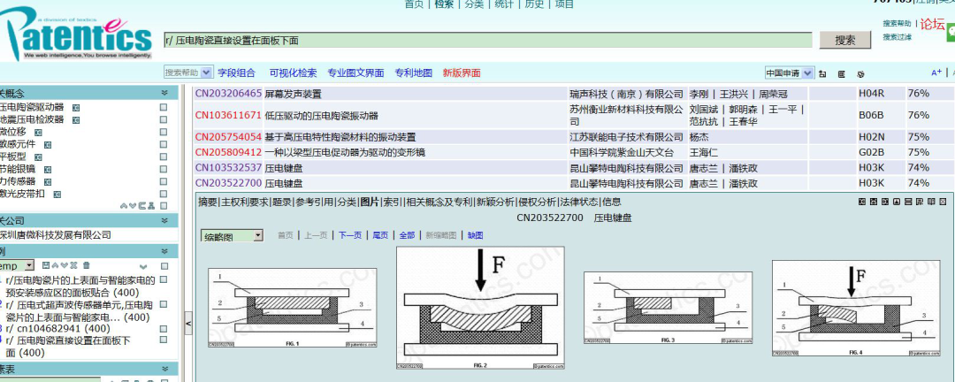 在Patentics中用申请号“R/2016101318078”进行检索,没有检索到能够用于评述该申请三性的对比文件。随后,调整检索策略,将改写提炼后的发明点“压电陶瓷直接设置在面板下面”作为检索要素进行语义检索,得到对比文件(CN203522700)的检索过程如下: