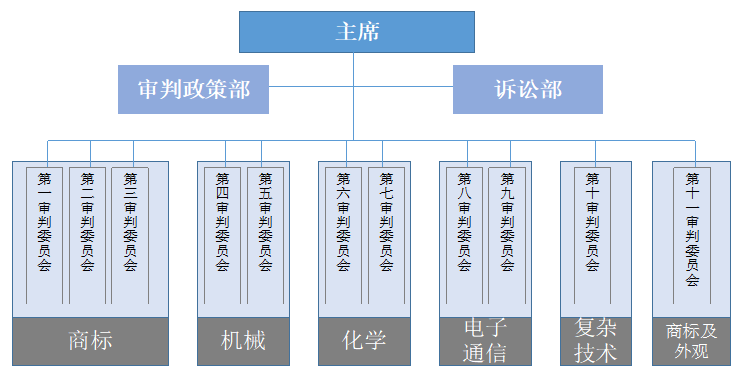 韩国司法实行的是三级三审制。目前,与知识产权相关的案件审判涉及的三级分别为韩国知识产权审判与上诉委员会(IPTAB)、韩国专利法院和大法院(韩国最高法院)。IPTAB是在合并了原审判委员会和上诉委员会的基础上成立的,于1998年3月1日起开始运作。它是韩国知识产权局中的准司法机构,作为知识产权相关案件的第一审级在KIPO中完全独立运作(类似但不完全等同于中国2018年3月机构改革之前的专利复审委员会在国家知识产权局中的位置)。IPTAB包括11个审判委员会(第1、2、3审判委员会负责商标案件,第4、5审判委员会负责机械专利案件,第6、7委员会负责化学专利案件,第8、9委员会负责电子通信专利案件,第10委员会负责复杂技术专利案件,第11委员会负责商标及外观设计案件),以及审判政策部和诉讼部。每个审判委员会包括约10名负责案件听审的专利行政法官(目前共有96名法官)[17],一般来说,这些法官都是在KIPO工作了10年以上的高级审查人员;审判政策部负责接收文件,进行形式审查,审判质量评估,口审等;诉讼部负责处理知识产权局局长作为被告的案件。