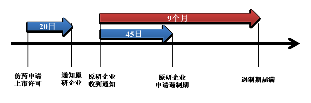 前述通知应自仿制药上市申请提交之日起20日内发出。若未能在前述期限发出通知,则MFDS将以仿制药申请人向登载专利的权利人或将该专利登载在“绿色清单”中的原研药企业发出通知之日(以较晚发生者为准),作为仿制药申请的提交日。若仿制药申请人始终未发出通知,则其仿制药上市申请将不予批准。(三)遏制期