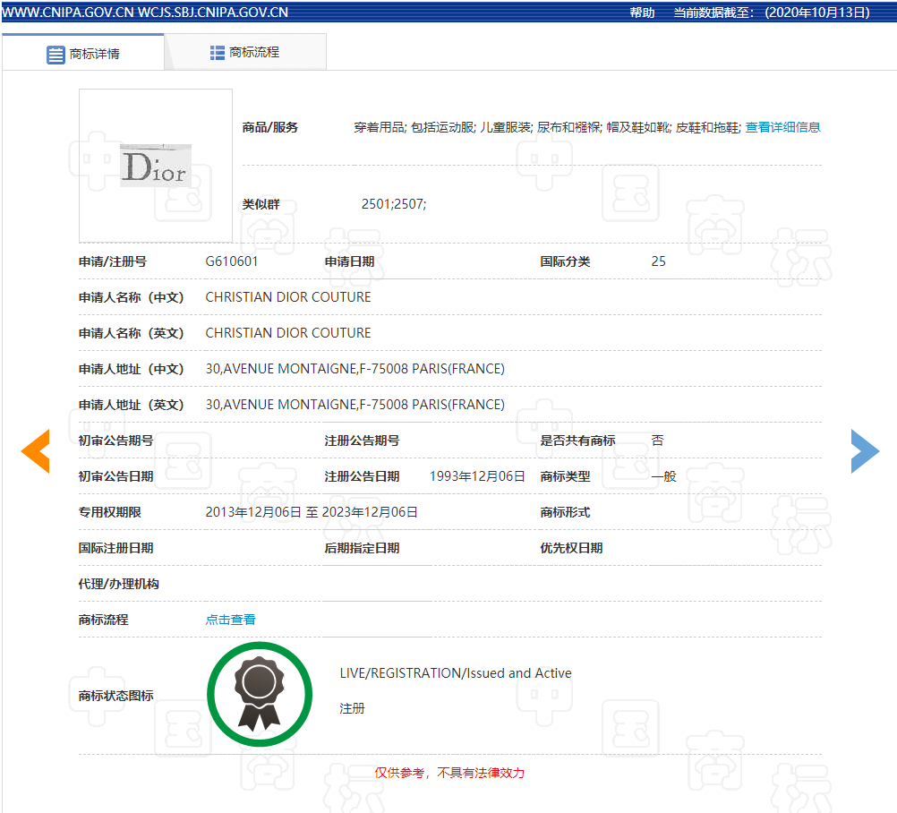 据了解,在商标评审阶段,克里斯蒂昂·迪奥尔公司提交了Dior(迪奥)品牌历史及文化介绍;媒体对克里斯蒂昂·迪奥尔公司商品和商标的报道;Dior(迪奥)奢侈品在华年度调查报告及克里斯蒂昂·迪奥尔公司产品销售数据、发票、合同等证明其在第25类商品上注册的第G610601号“Dior”商标(下称引证商标,详情见下图2)知名度的证据材料。