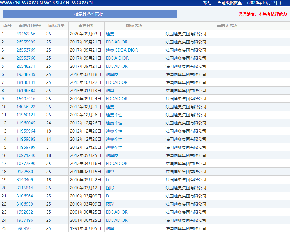 除了上述案件中的“迪奥及图”商标外,记者通过中国商标网查询到,法国迪奥公司还申请注册了多件商标,包括“迪奥”“EDDADIOR”“迪奥EDDADIOR”等(详情见下图4)。