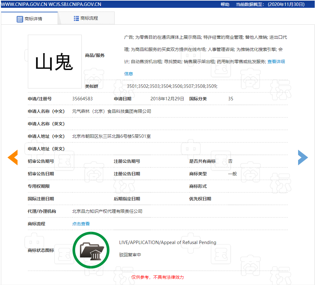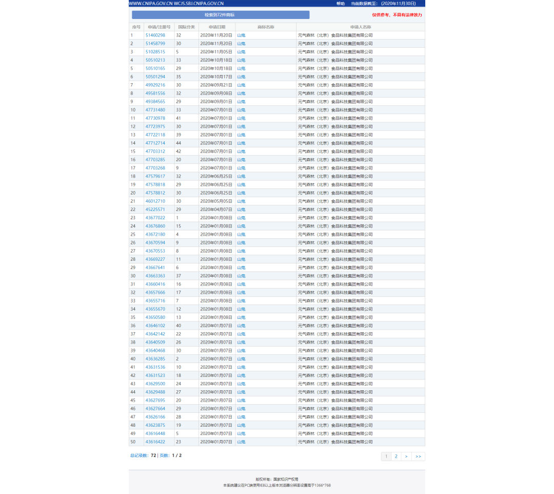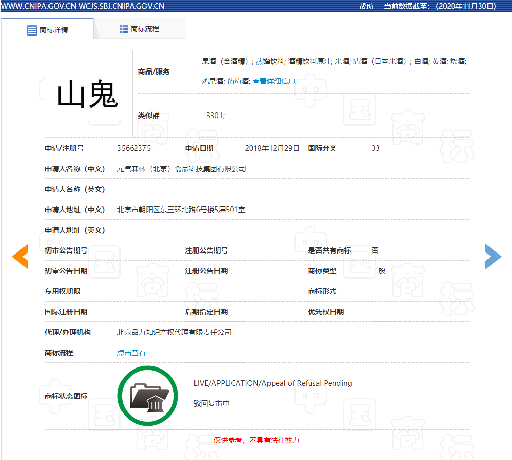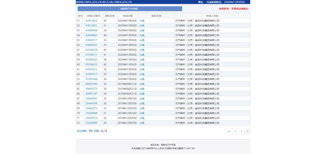 作为一家互联网创新型饮品公司,元气森林公司为何要申请注册“山鬼”商标呢?原来,公开资料显示,山鬼是一家发展中的连锁拉面品牌,隶属于元气森林公司,而元气森林公司的企业名称之所以由此前的北京元气森林饮料有限公司变更为如今的元气森林(北京)食品科技集团有限公司,相信也与其正在布局饮料之外的其他食品领域有关。记者登录中国商标网查询到,目前,元气森林公司共提交了72件“山鬼”商标的注册申请,最早提交申请的日期为2018年12月29日。