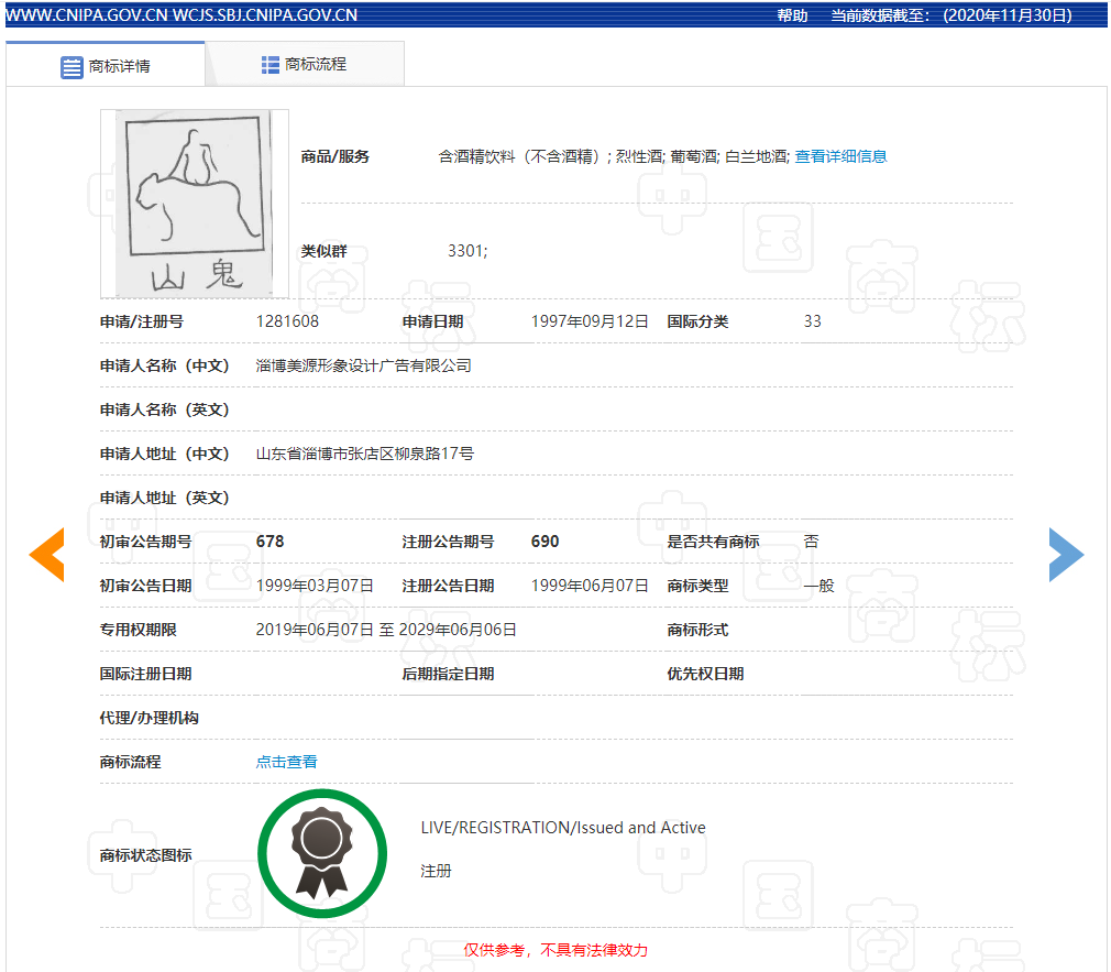 据了解,在诉争商标一涉及的案件中,国家知识产权局认为,诉争商标一与第1281608号“山鬼及图”商标(下称引证商标一,详情见下图3)已构成近似标识,诉争商标一指定使用的果酒(含酒精)等商品与引证商标一共存于市场,容易导致相关公众对商品来源产生混淆、误认,二商标已构成我国商标法所指在同一种或类似商品上的近似商标,遂对诉争商标一予以驳回。
