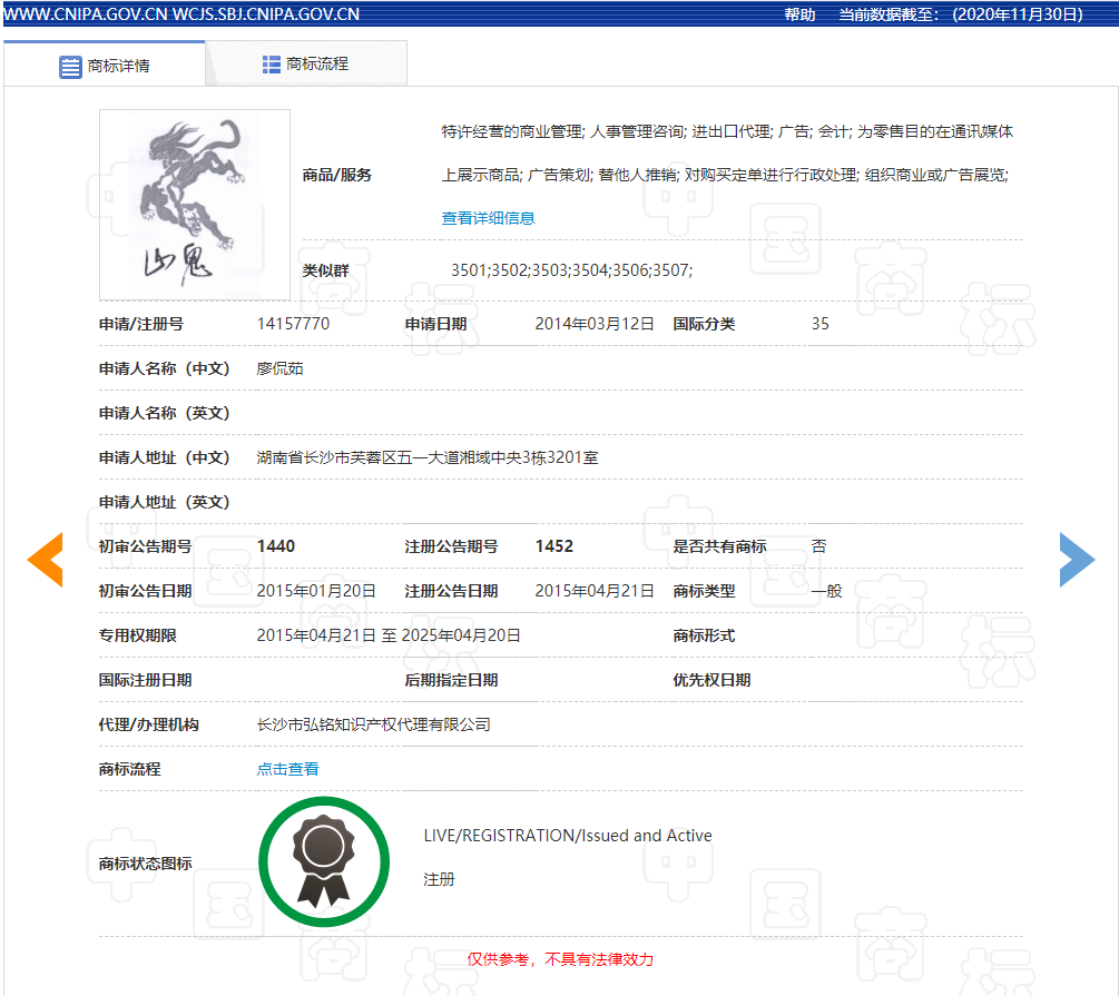 而在诉争商标二涉及的案件中,国家知识产权局认为,诉争商标二与第14157770号“山鬼及图”商标(下称引证商标二,详情见下图4)构成我国商标法所指在同一种或类似服务上的近似商标,遂对诉争商标二的注册申请予以驳回。
