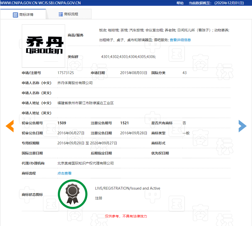 据了解,2015年8月3日,乔丹体育公司申请注册了第17573125号“乔丹QIAODAN”商标(下称诉争商标,详情见下图),被核定使用在第43类“饭店;咖啡馆;茶馆等”服务上。针对该诉争商标,耐克公司提起了无效宣告请求。