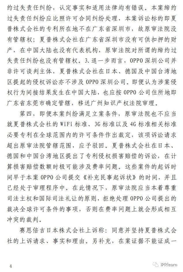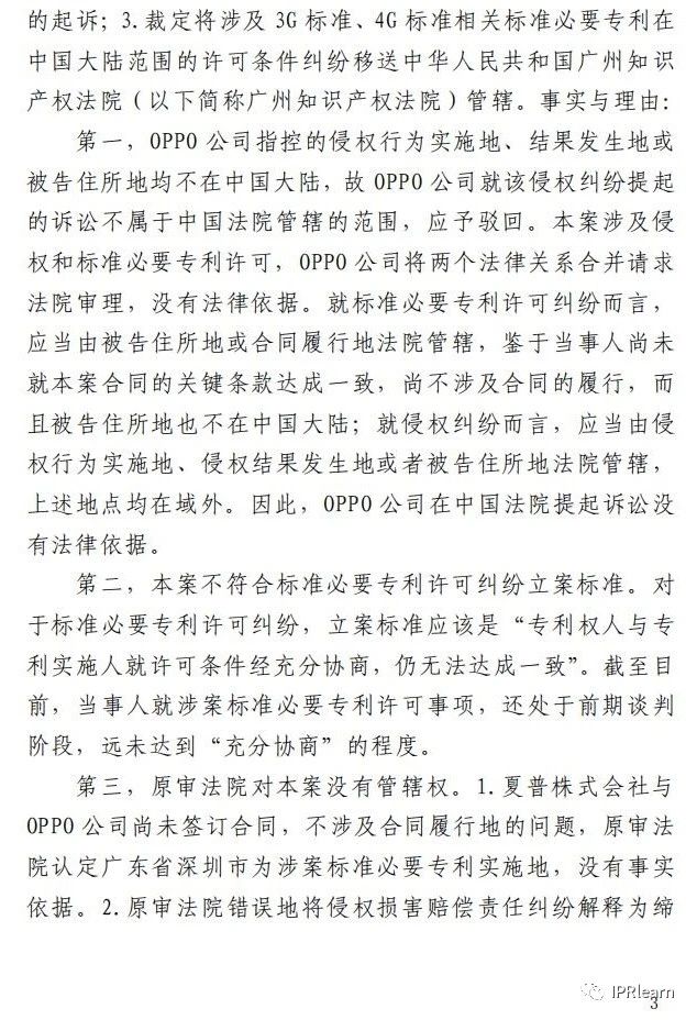 夏普株式会社上诉请求:1.撤销原审裁定,驳回OPPO公司、OPPO深圳公司的起诉;2.如以上请求不能全部满足,则依法裁定驳回OPPO公司、OPPO深圳公司关于侵权损害赔偿、裁决WiFi标准相关标准必要专利全球许可条件及裁决3G标准、4G标准相关标准必要专利在中国大陆范围外的许可条件的起诉;3.裁定将涉及3G标准、4G标准相关标准必要专利在中国大陆范围的许可条件纠纷移送中华人民共和国广州知识产权法院(以下简称广州知识产权法院)管辖。
