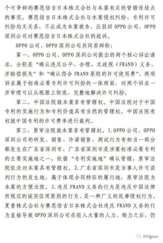 OPPO公司、OPPO深圳公司共同答辩称:第一,OPPO公司、OPPO深圳公司提出的两个核心诉讼请求,分别是“确认违反公平、合理、无歧视(FRAND)义务,并赔偿损失”和“确认符合FRAND原则的许可使用费”,两项诉求属于标准必要专利许可纠纷的一体两面,对两个诉求一并审理可以从根源上彻底、完整地解决许可纠纷。第二,中国法院就本案享有管辖权。中国法院对于中国专利的实施行为和专利价值具有当然的管辖权。中国法院有权就中国专利的许可费率进行裁判。第三,原审法院就本案享有管辖权。第四,中国法院有权就涉案标准必要专利的全球许可条件进行裁判。综上,请求驳回上诉,维持原裁定。