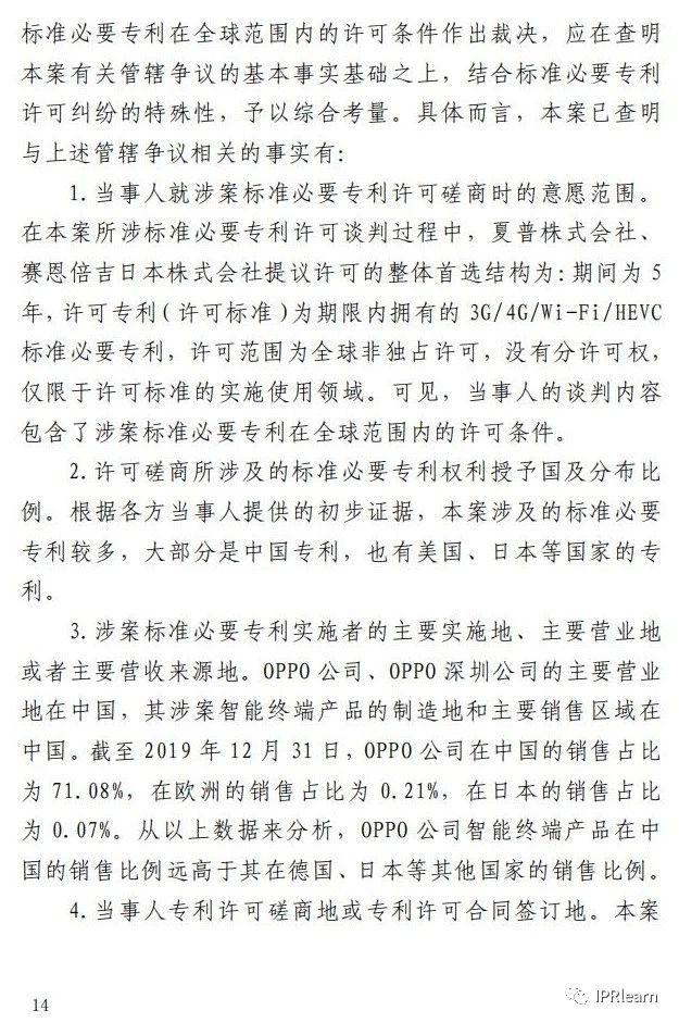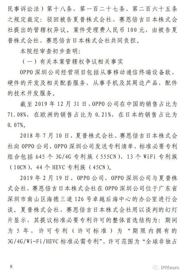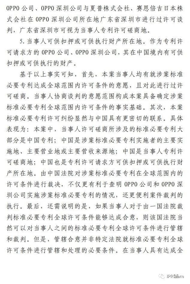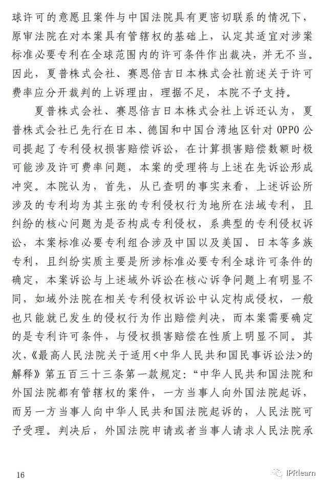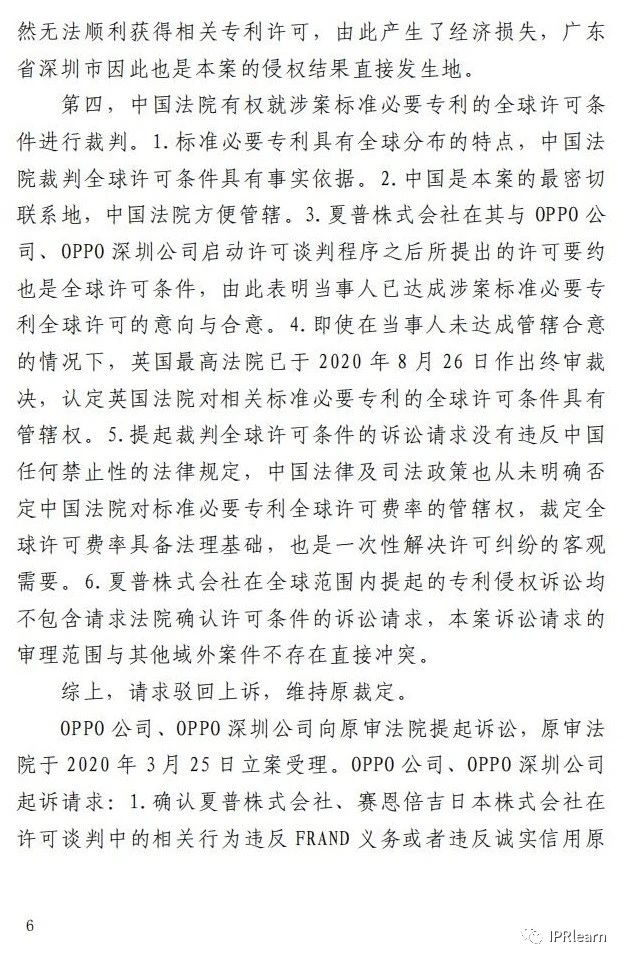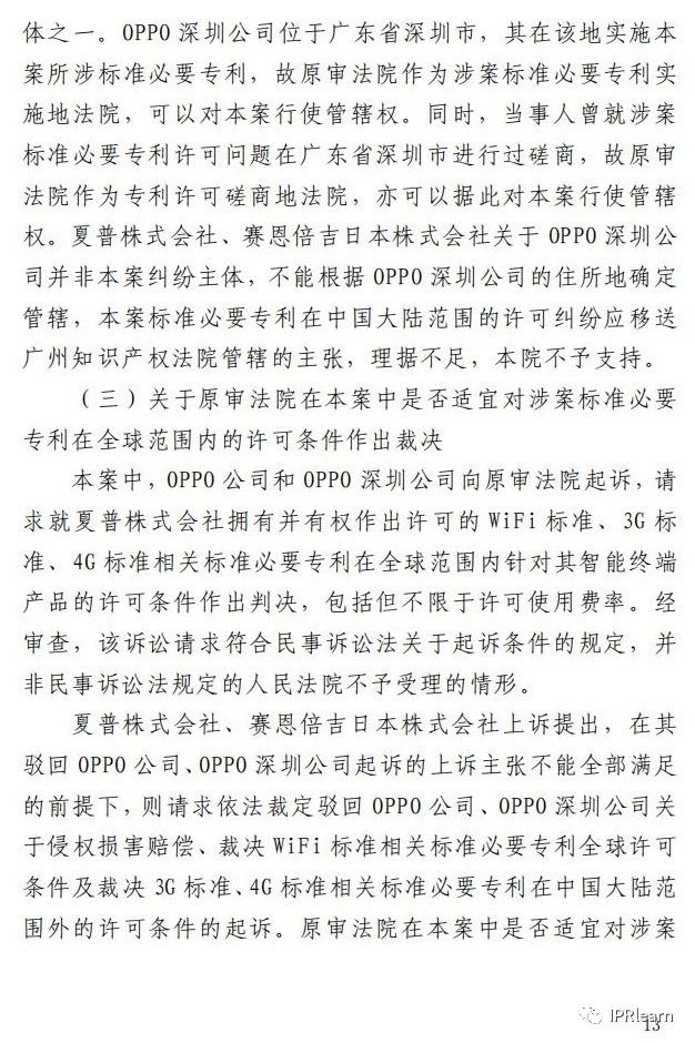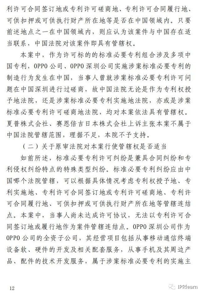 更多 >>2021年8月19日,最高人民法院知识产权法庭就上诉人夏普株式会社、赛恩倍吉日本株式会社与被上诉人OPPO广东移动通信有限公司(以下简称OPPO公司)、OPPO广东移动通信有限公司深圳分公司(以下简称OPPO深圳公司)标准必要专利许可纠纷管辖权异议一案作出终审裁定:夏普株式会社、赛恩倍吉日本株式会社的上诉请求均不能成立,应予驳回;原审裁定认定事实清楚,适用法律正确,应予维持。这是我国最高司法机关首次明确对标准必要专利全球许可条件的管辖规则,对我国从防御型法治转向引领型法治、积极参与全球知识产权治理规则制定具有里程碑意义。