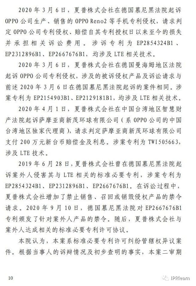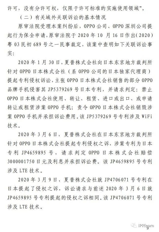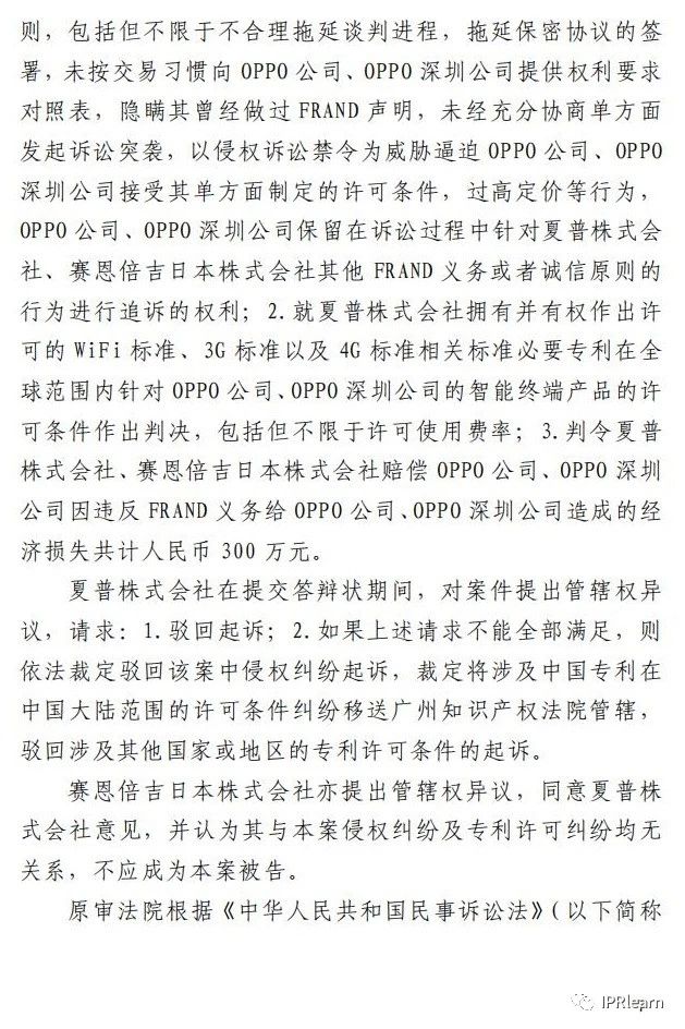 此前,OPPO公司、OPPO深圳公司向原审法院提起诉讼,原审法院于2020年3月25日立案受理。OPPO公司、OPPO深圳公司起诉请求:1.确认夏普株式会社、赛恩倍吉日本株式会社在许可谈判中的相关行为违反FRAND义务或者违反诚实信用原则,包括但不限于不合理拖延谈判进程,拖延保密协议的签署,未按交易习惯向OPPO公司、OPPO深圳公司提供权利要求对照表,隐瞒其曾经做过FRAND声明,未经充分协商单方面发起诉讼突袭,以侵权诉讼禁令为威胁逼迫OPPO公司、OPPO深圳公司接受其单方面制定的许可条件,过高定价等行为,OPPO公司、OPPO深圳公司保留在诉讼过程中针对夏普株式会社、赛恩倍吉日本株式会社其他FRAND义务或者诚信原则的行为进行追诉的权利;2.就夏普株式会社拥有并有权作出许可的WiFi标准、3G标准以及4G标准相关标准必要专利在全球范围内针对OPPO公司、OPPO深圳公司的智能终端产品的许可条件作出判决,包括但不限于许可使用费率;3.判令夏普株式会社、赛恩倍吉日本株式会社赔偿OPPO公司、OPPO深圳公司因违反FRAND义务给OPPO公司、OPPO深圳公司造成的经济损失共计人民币300万元。