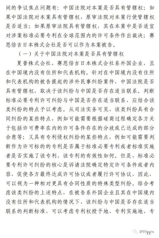 经查明,法院认为,本案系标准必要专利许可纠纷管辖权异议案件。根据当事人的诉辩情况及初步查明的事实,本案二审期间的争议焦点问题有:中国法院对本案是否具有管辖权;如果中国法院对本案具有管辖权,原审法院对本案行使管辖权是否适当;如果原审法院具有管辖权,其在本案中是否适宜对涉案标准必要专利在全球范围内的许可条件作出裁决;赛恩倍吉日本株式会社是否可以作为本案被告。