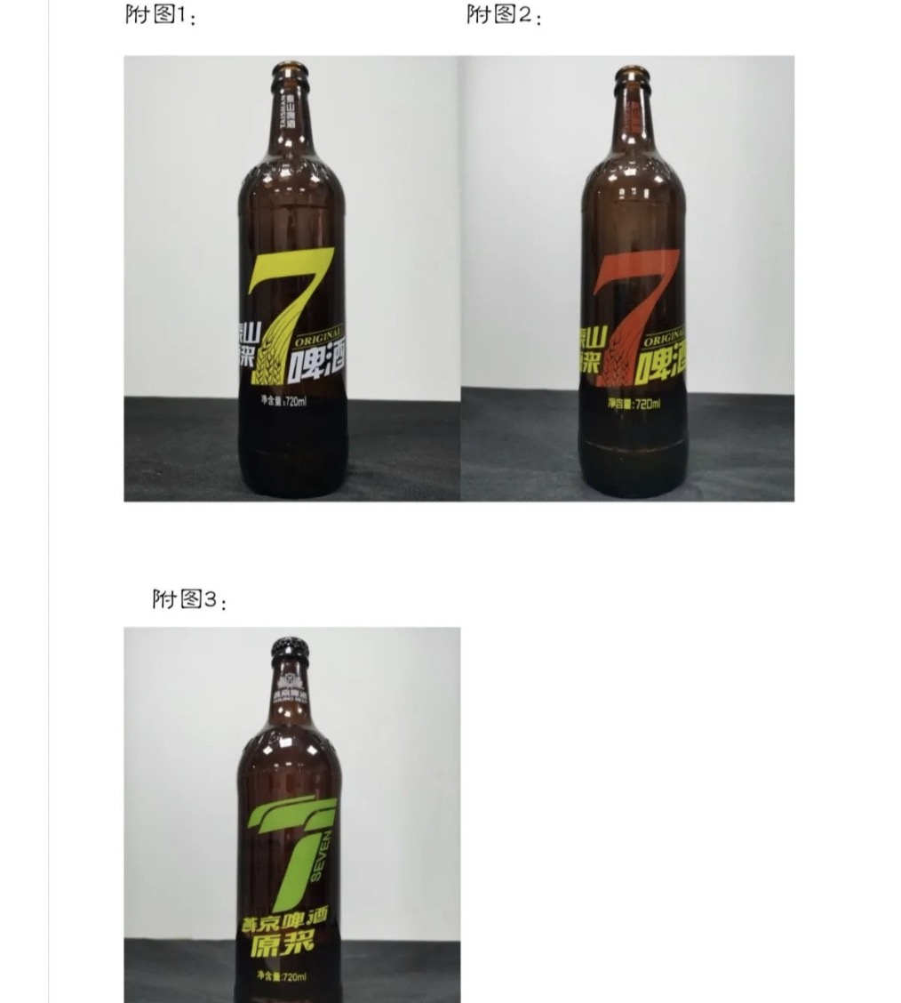 关于涉案啤酒产品和被诉侵权产品的包装、装潢。将泰山啤酒公司主张权利的两款涉案啤酒产品(详见附图1、附图2)与被诉侵权产品(附图3)的包装、装潢进行比对。在产品包装上,泰山啤酒公司的两款涉案啤酒产品包装与被诉侵权产品的包装基本相同,均为720ml容量、瓶颈较短、瓶身较长的深棕色玻璃瓶。在产品装潢上,瓶体标识均采用烤花工艺,两者的相似之处在于:瓶身正面正中间均为较大的艺术设计数字“7”,正面标识整体均由艺术数字“7”“泰山”“燕京”、原浆、啤酒等字体元素组合,数字“7”字体明显大于中文文字,且位于正面标识的中间位置。瓶颈部和瓶身的连接处的位置,均有14个字母构成的大写的、凸起的拼音,且无任何颜色。瓶身背面均标注有原料、保质期、制造商、产地等信息。两者的区别在于:泰山啤酒公司主张权利的涉案啤酒产品的啤酒瓶颈贴为“泰山啤酒 TAISHAN”,中文加拼音,竖向排列;被诉侵权产品的啤酒瓶颈贴为麦穗文字组合商标图形、燕京啤酒与YANJING BEER组成,横向排列。泰山啤酒公司的涉案啤酒产品瓶颈部和瓶身连接部位的凸起为拼音“TAISHAN”,被诉侵权产品该部位的凸起为“YANJING”;泰山啤酒公司的涉案啤酒产品瓶体正面标识上艺术数字“7”颜色为黄色、红色,数字“7”位于文字“泰山原浆”与“啤酒”中间,“啤酒”文字上方有“original”一词;被诉侵权产品上的数字“7”由四块绿色色彩拼合而成,旁边竖排有大写的“SEVEN”,数字“7”位于“燕京啤酒原浆”文字的上方。
