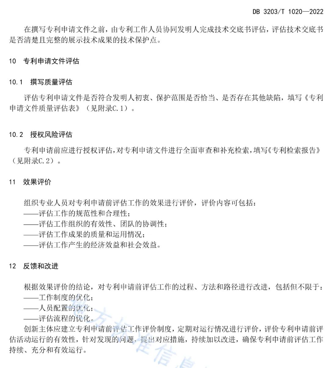 《规范》从10个方面系统阐述了专利申请前评估过程的原则、流程、基础条件、专利战略布局评估、技术成果评估、技术交底书评估、专利申请文件评估等主要技术内涵,指导创新主体对技术成果进行筛选、挖掘、依据检索有针对性的分析出技术热点、技术空白等分层专利战略布局,筛选不必要的低质量专利申请,有效减少非正常专利申请数量,促进高质量专利产出。