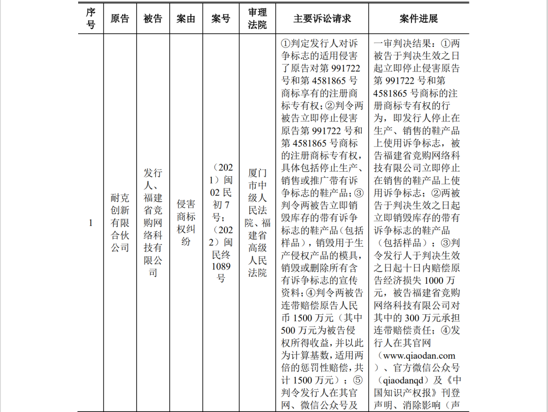 其招股书显示,此前,中乔体育收到了厦门市中级人民法院于2021年1月12日出具的应诉通知书〔(2021)闽02民初7号〕,耐克创新起诉中乔体育及福建省竞购网络科技有限公司(下称“福建竞购公司”)侵犯其商标权。