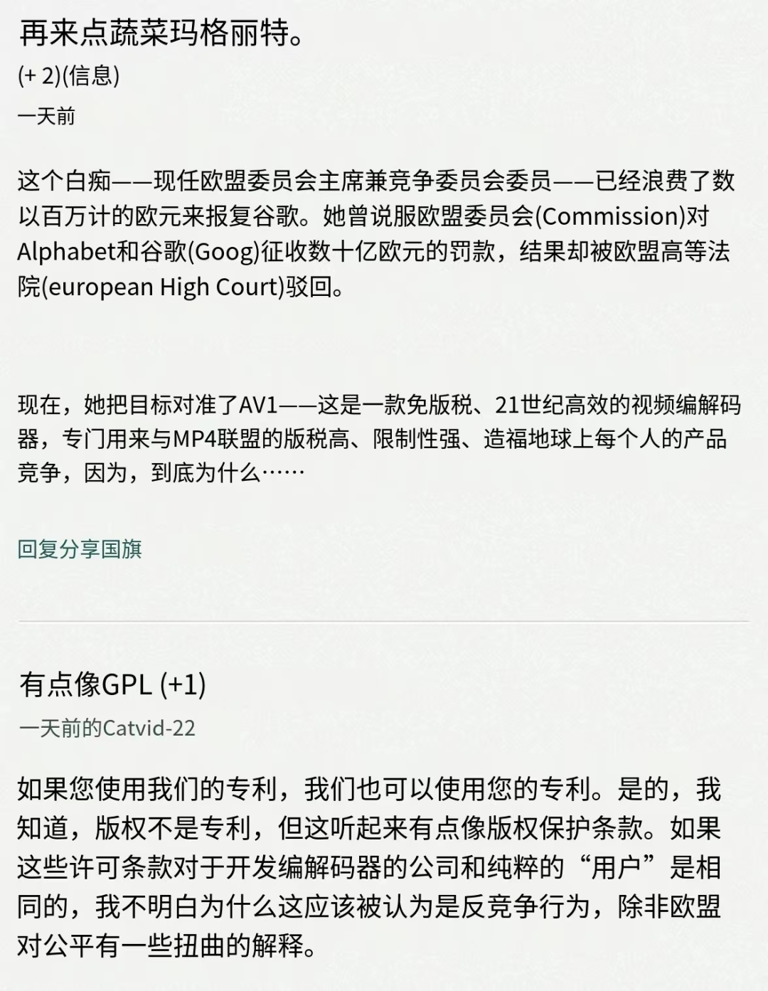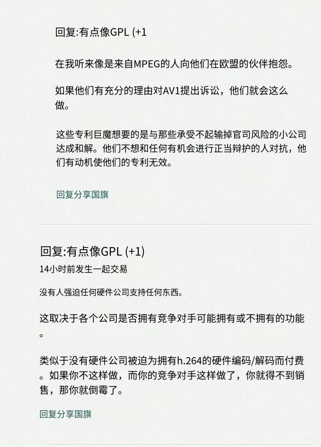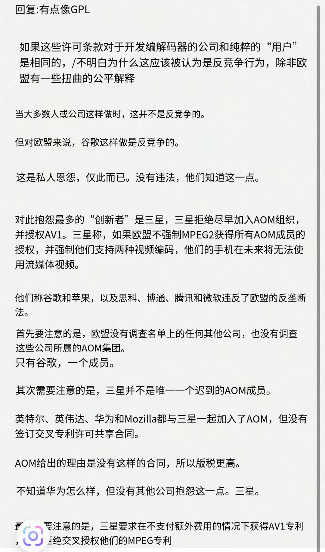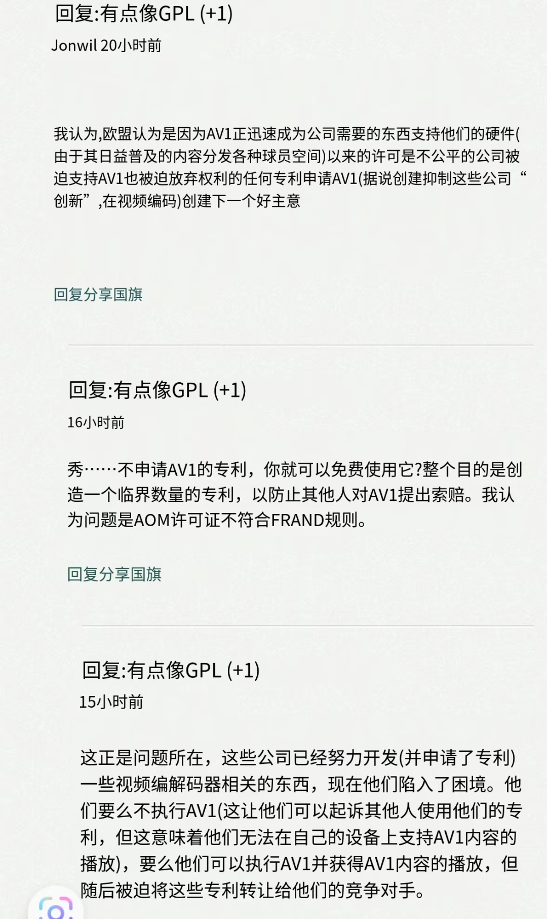 去年,欧盟反垄断机构的这一举动,让国外网友们也坐不住了。有些网友在批评欧盟反垄断机构在对免费版的AV1动手,也有些人把AOM的政策类比开源GPL的专利政策。