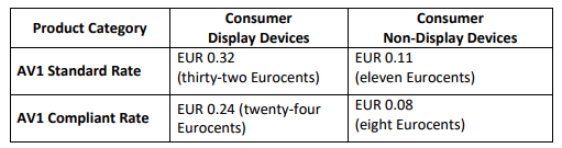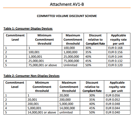 在实际许可费率上,Sisvel运营的VP9、AV1分别给出了许可费率,以及折扣情况。以AV1的费率为例,可以看到,这个费率,相对于HEVC相比,差异不大。