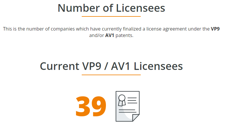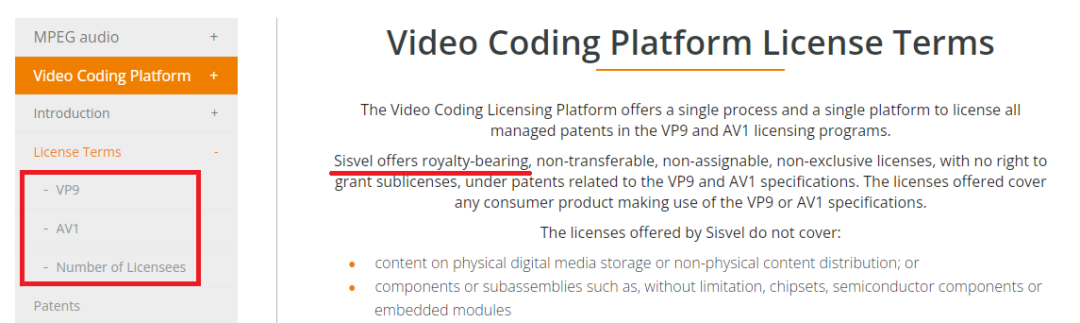 而且这部分专利权人还成立了VP9和AV1的专利池,由Sisvel负责管理。Sisvel网站上明确表示,这个专利池是收费的。且目前的被许可人已有39家。