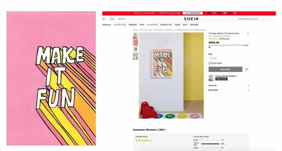 三位艺术家的作品(左)与shein涉嫌侵权的产品(右)