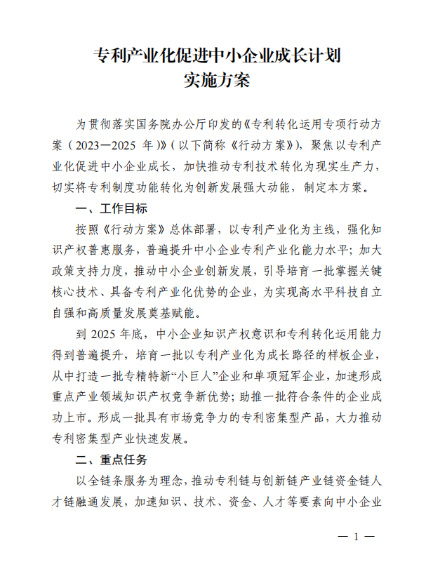五部门发《专利产业化促进中小企业成长计划实施方案》