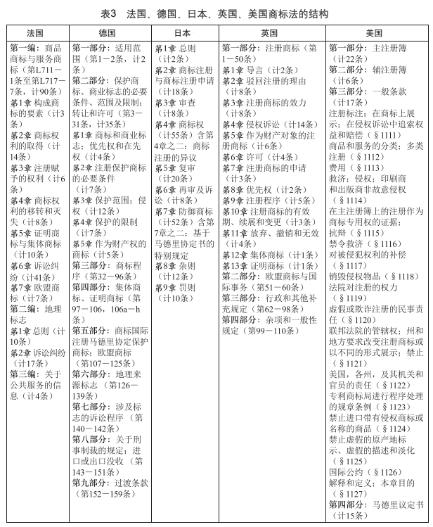我国知识产权立法大量借鉴国外的立法例,这是历史事实,也符合我国改革开放的国策与市场经济发展以及全球化的要求。知识产权制度并非我国固有制度,“无论我们依据的思想、理论,抑或我们采用的概念、方法,甚或我们研究的对象、问题等,都是知识引进的产物,都离不开翻译和移植”。十余年前,刘春田老师主编“世界知识产权法典译丛”,大规模翻译主要国家的知识产权立法,在商标法方面是委托董葆霖先生主事,由其组织力量翻译了《十二国商标法》。本文从中选择主要国家的商标法加以对比,以考察和总结其条文结构及私权?;ぬ氐?#xff08;见表3)。这些国家包括最早实行商标注册立法的法国,大陆法系典型的德国和日本,最早采用判例?;ど瘫甑挠⒐?#xff0c;以及普通法系典型的美国。需要说明的是,这些翻译文本距今已过十年多,各国法律条文已屡次修订,因此,本文在论及法律结构以及条文内容时,均基于其官方网站的最新文本。