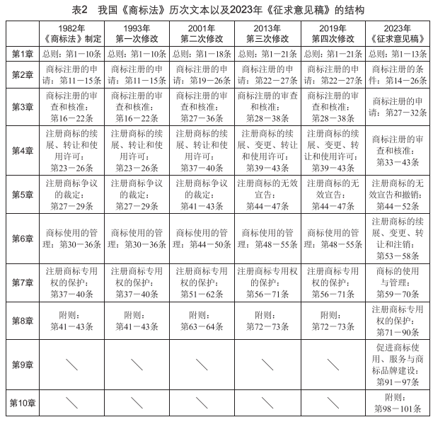 经表2简单对比可以发现,我国《商标法》的条文结构在过去四十多年当中基本保持不变。1982年《商标法》制定,其全文包含8章计43条。1993年第一次修改,只涉及少量条文修改,条文顺序与结构均无变化。2001年第二次修改,条文数量与内容有较大幅度增加,全文包含8章计64条。2013年第三次修改,在结构上有一定调整,第5章更名为“注册商标的无效宣告”,条文数量亦增至73条。2019年第四次修改,改动有限,各章结构及条文总量保持不变。2023年《征求意见稿》共包含10章计101条,部分章节对现行《商标法》作出大幅度调整。其中,对现行《商标法》第1章“总则”进行拆分,新设一章“商标注册的条件”;另新增一章“促进商标使用、服务与商标品牌建设”;有两章改动名称,其中一章由“注册商标的无效宣告”更名为“注册商标的无效宣告和撤销”,另一章由“注册商标的续展、变更、转让和使用许可”更名为“注册商标的续展、变更、转让和注销”,补充了商标权消灭的两种情形。