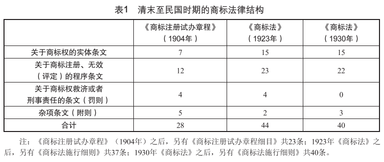 追溯我国的商标立法,一般以1904年清政府颁行的《商标注册试办章程》为始。19世纪后期,清政府与西方列强相遇,给中国带来所谓的“三千年未有之大变局”,究其实质是传统农业文明与现代化工业文明的竞争。因此,无论清政府的失败还是随之而来的制度变革,以及最终转向全面引入西方法律制度,其实都是一种历史的必然,也是制度竞争的明智选择。正是在此背景下,商标注册制度开始被引入中国,最初采用海关挂号的方式,旨在?;ぱ笊痰睦妗?901年清政府与英国、美国、葡萄牙、日本等国订立的通商条约中规定了商标?;ぬ蹩?#xff0c;随后于1904年颁布《商标注册试办章程》。这部法律总共28个条文,尽管发挥的作用有限,但它开启了中国的商标注册与?;ぶ贫取?911年清政府被推翻,次年成立的民国政府延续了这种商标制度。1923年,北洋政府制定《商标法》,这是我国历史上第一部正式冠以“商标法”之名的法律。1930年,国民政府重新制定《商标法》,共计40条,后于1935年、1940年两度修改。清末至民国时期的商标法律(见表1),最初显然系受到国外压力而立法施行,但是以此而后,商标法已然成为我国法律体系的一个重要组成部分。观诸其条文结构,无论《商标注册试办章程》还是两部《商标法》,均未设章节;从条文内容来看,主要涉及商标注册、无效(当时称为“评定”)等程序性规范,当然也包含相当数量的条文,系涉及商标专用权及其救济(赔偿)、权利转移、权利消灭等实体性私法规范。