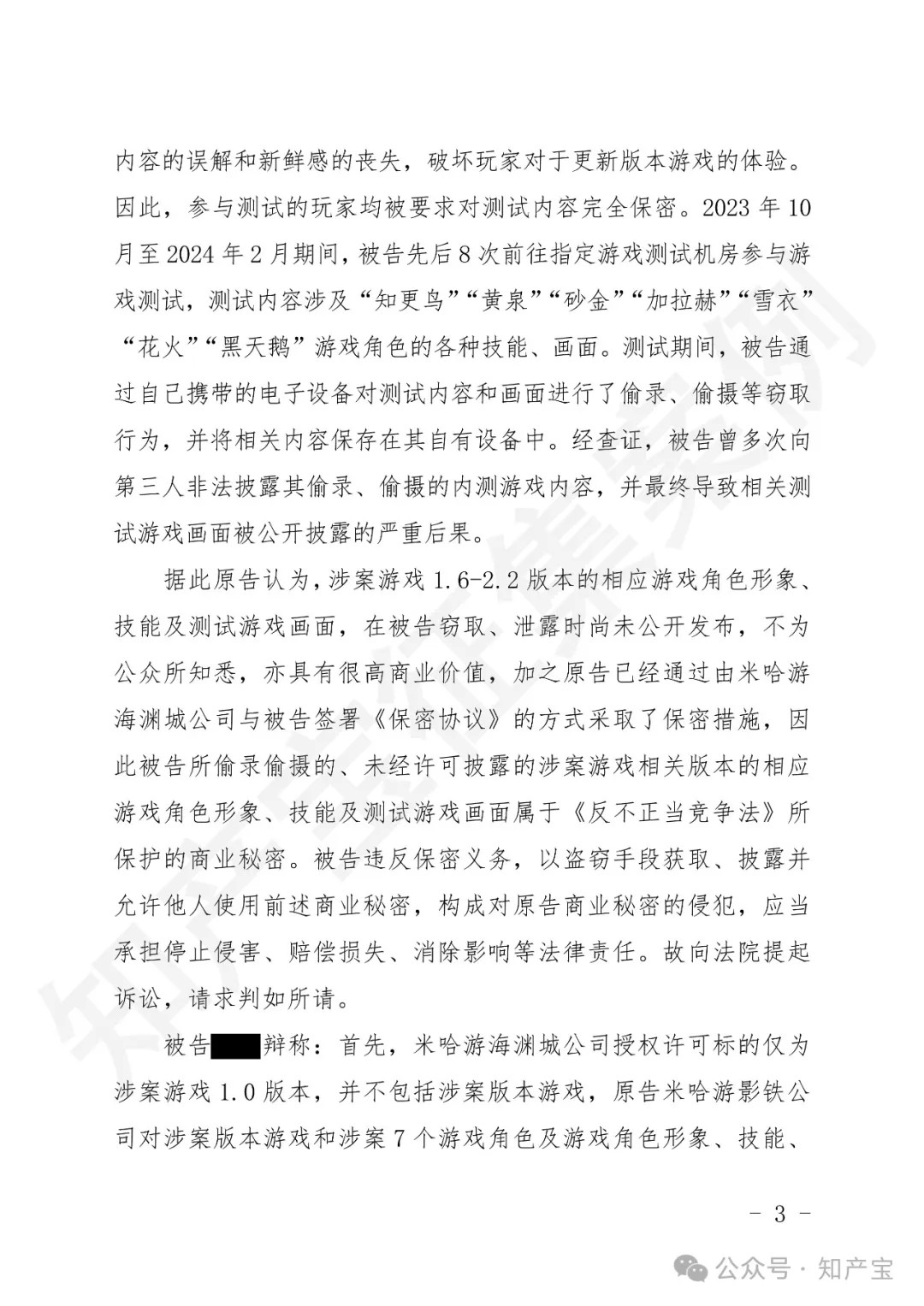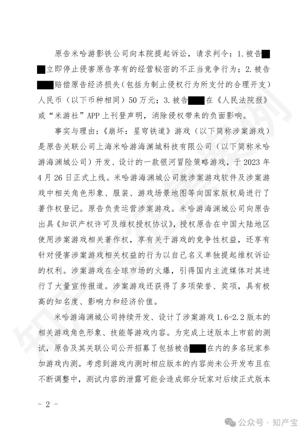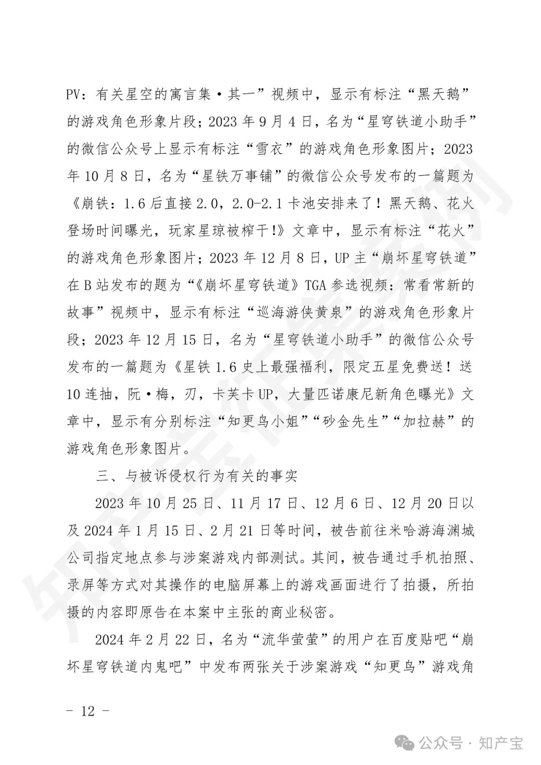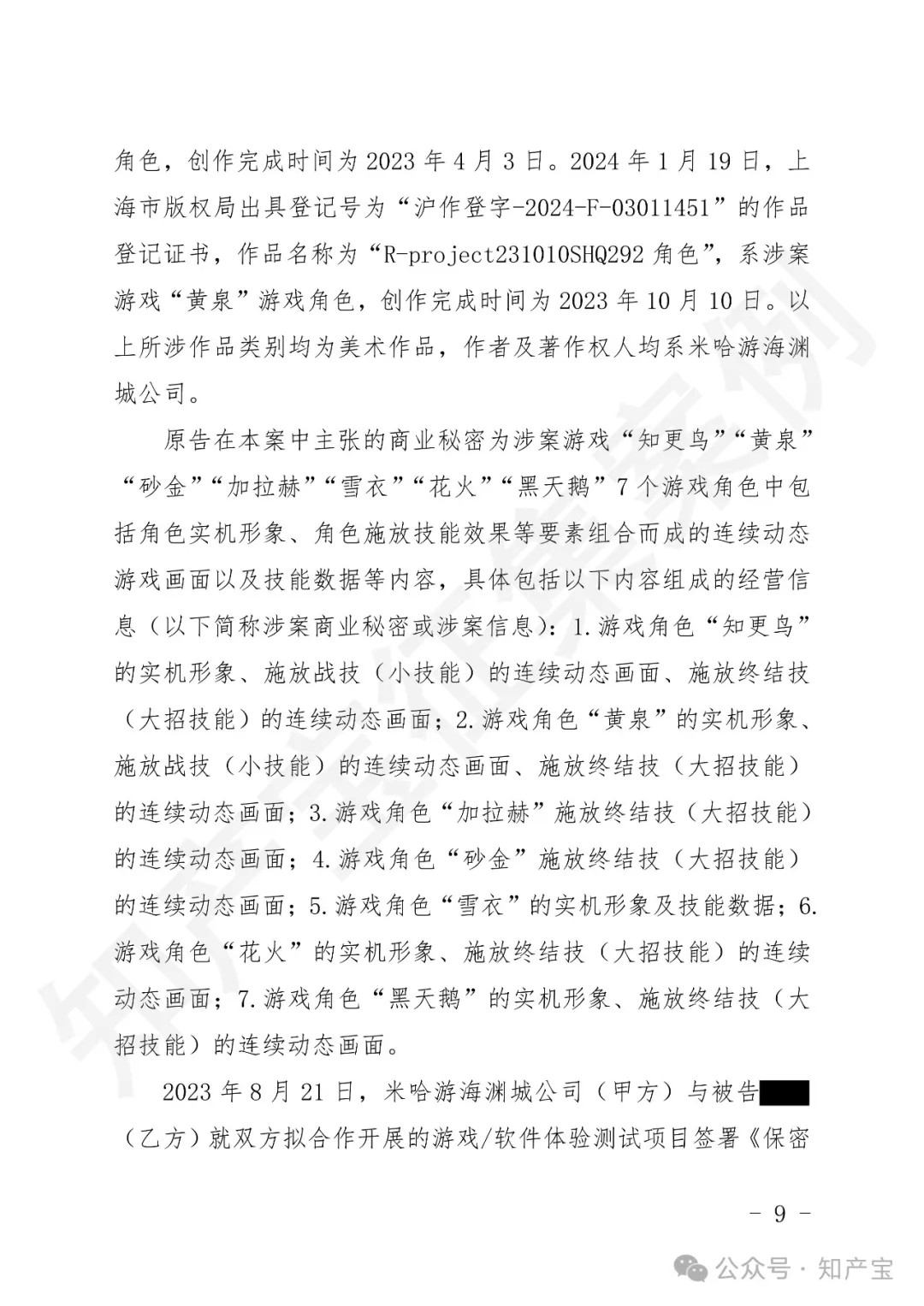 《崩坏:星穹铁道》未公开游戏角色商业秘密保护案