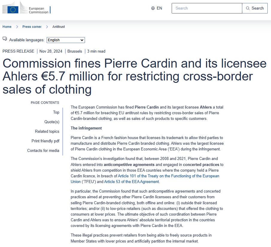 近日,欧盟委员会表示,已对法国时装公司 Pierre Cardin(皮尔·卡丹)和德国服装制造商 Ahlers(Pierre Cardin在欧洲经济区最大的授权商)处以总计570万欧元的???#xff0c;原因是它们违反了欧盟反垄断规则。其中Pierre Cardin被罚款220万欧元,而 Ahlers 则被???50万欧元。