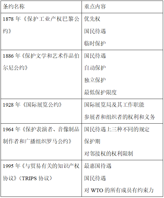 展会中的知识产权问题不仅涉及一国的国内法律,还受到国际条约的约束。国际条约为国际展会中的知识产权纠纷提供了大背景。主要的国际条约如下表:
