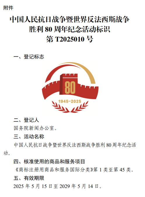 依据《特殊标志管理条例》,对国务院新闻办公室提交的“中国人民抗日战争暨世界反法西斯战争胜利80周年纪念活动标识”特殊标志登记申请予以核准。