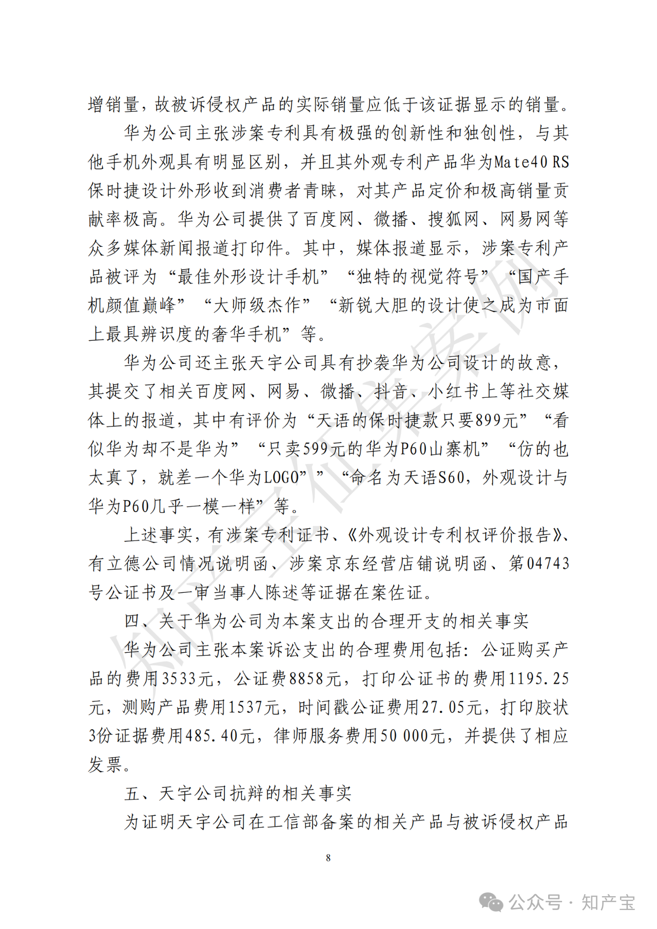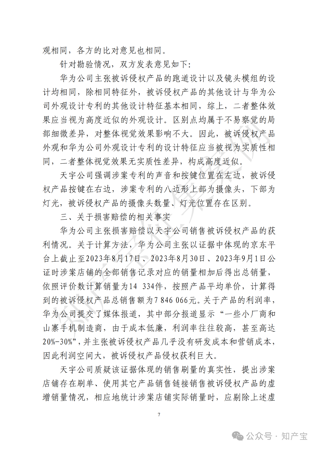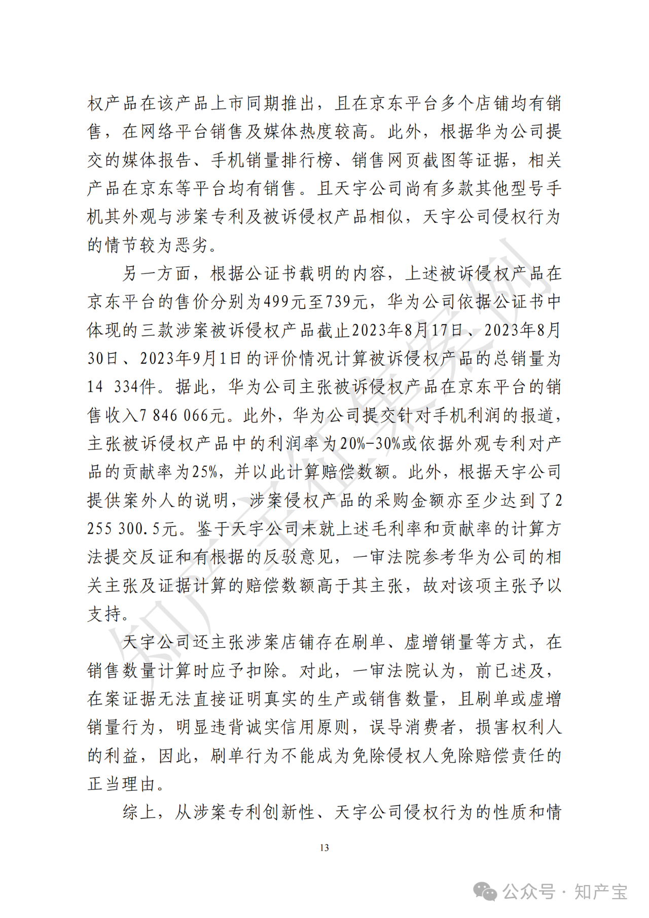 本案中,涉案专利与现有设计相比具有明显区别,且其对应的专利产品经过华为公司宣传推广,具有较高知名度。涉案被诉侵权行为在华为公司专利产品上市同期推出,被诉侵权产品在京东、拼多多等平台多个店铺均有销售,在网络平台销售及媒体热度较高?;靖菥┒教ㄉ舷允镜氖奂酆拖拷辛斯?#xff0c;主张销售收入7846066元,并提交针对手机利润的报道,主张被诉侵权产品的利润率为20%-30%。根据天宇公司提供案外人的说明,涉案侵权产品采购金额至少达到2255300.5元。法院参考上述主张及证据计算的赔偿数额高于华为公司主张的100万元,故对华为公司主张的赔偿额予以全额支持。天宇公司尚有多款其他型号手机外观与涉案专利及被诉侵权产品相似,侵权行为较为恶劣。天宇公司主张刷单虚增销量,在案证据无法直接证明其主张,且刷单或虚增销量行为明显违背诚实信用原则,误导消费者,损害权利人利益,因此不能成为免除侵权人赔偿责任的正当理由。