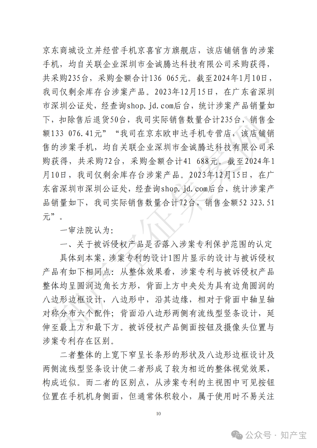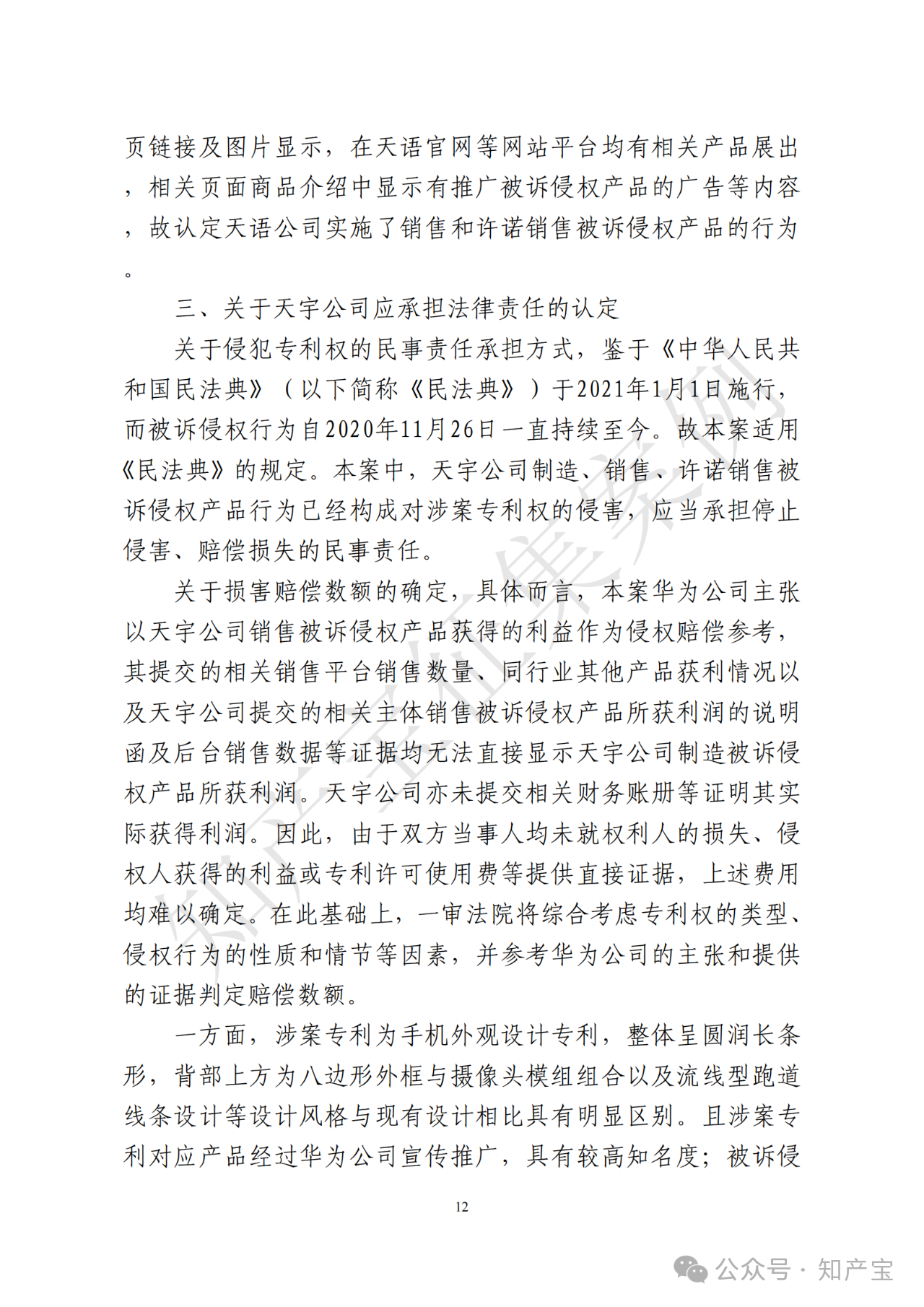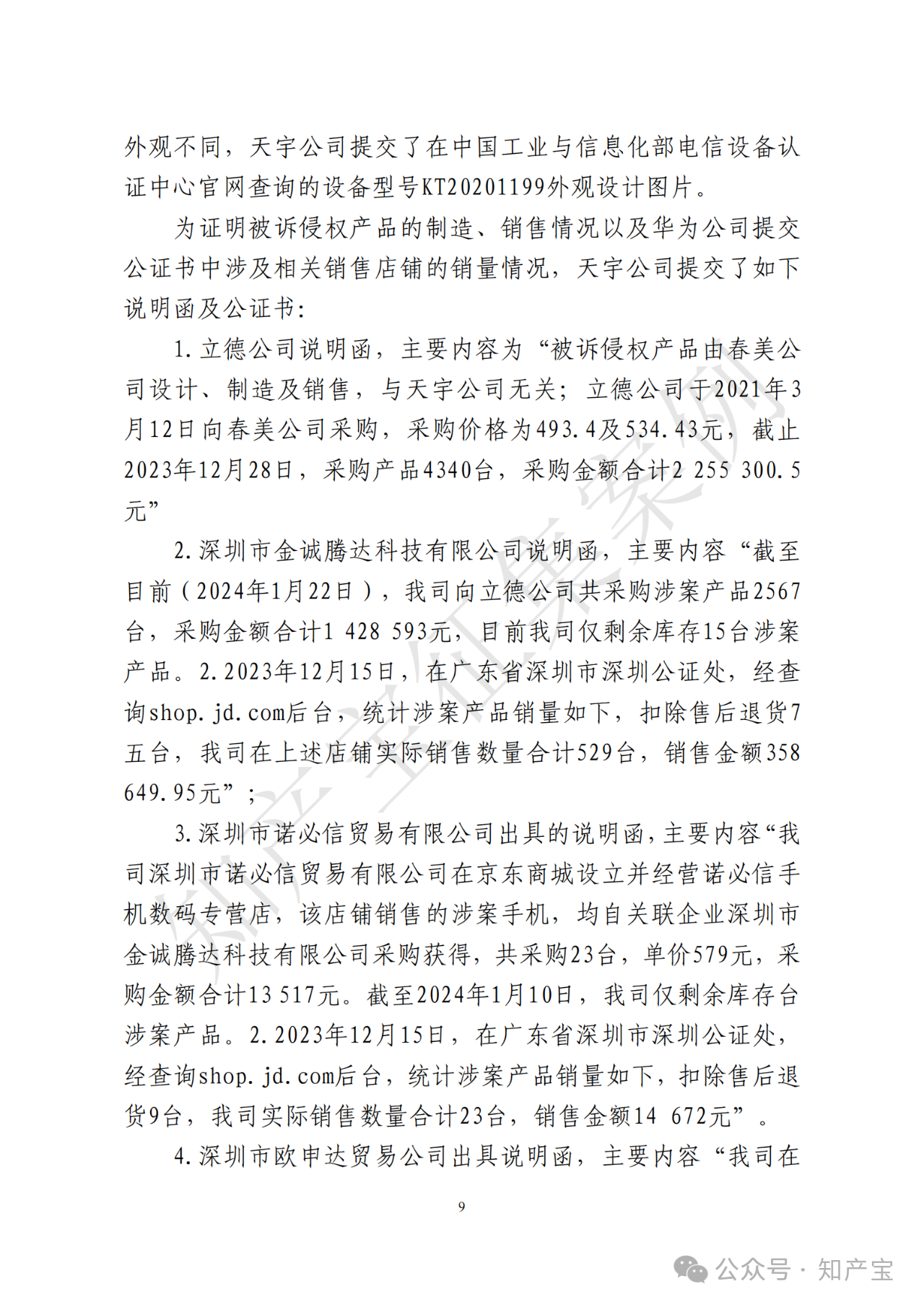 本案中,涉案专利与现有设计相比具有明显区别,且其对应的专利产品经过华为公司宣传推广,具有较高知名度。涉案被诉侵权行为在华为公司专利产品上市同期推出,被诉侵权产品在京东、拼多多等平台多个店铺均有销售,在网络平台销售及媒体热度较高?;靖菥┒教ㄉ舷允镜氖奂酆拖拷辛斯?#xff0c;主张销售收入7846066元,并提交针对手机利润的报道,主张被诉侵权产品的利润率为20%-30%。根据天宇公司提供案外人的说明,涉案侵权产品采购金额至少达到2255300.5元。法院参考上述主张及证据计算的赔偿数额高于华为公司主张的100万元,故对华为公司主张的赔偿额予以全额支持。天宇公司尚有多款其他型号手机外观与涉案专利及被诉侵权产品相似,侵权行为较为恶劣。天宇公司主张刷单虚增销量,在案证据无法直接证明其主张,且刷单或虚增销量行为明显违背诚实信用原则,误导消费者,损害权利人利益,因此不能成为免除侵权人赔偿责任的正当理由。