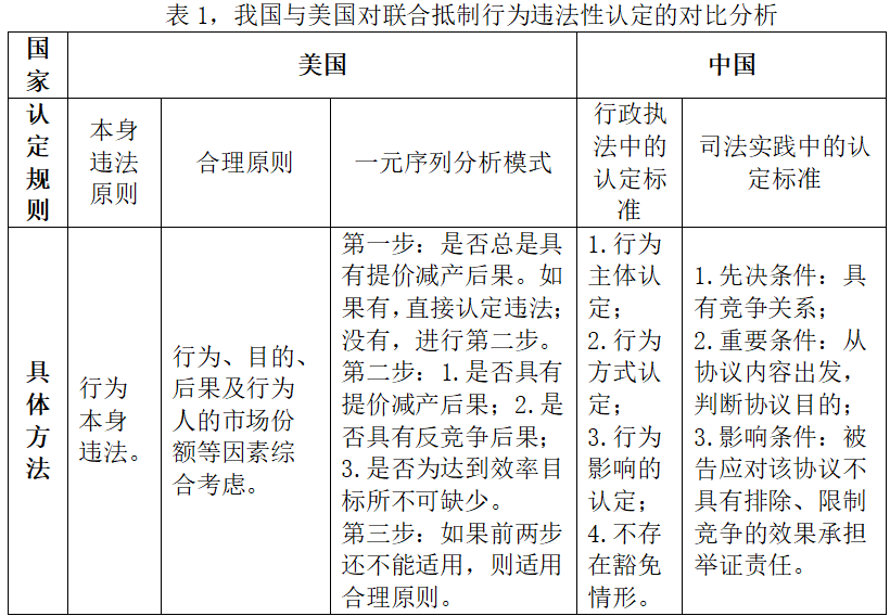 根据我国行政执法和司法实践中的案例可以得出,我国目前对联合抵制的违法性认定标准主要是从相关主体、协议内容、垄断影响等方面进行综合考量,为了便于理解,特别是通过对比借鉴美国的认定标准,我们可以通过总结并借助图表进行对比分析。图表如下: