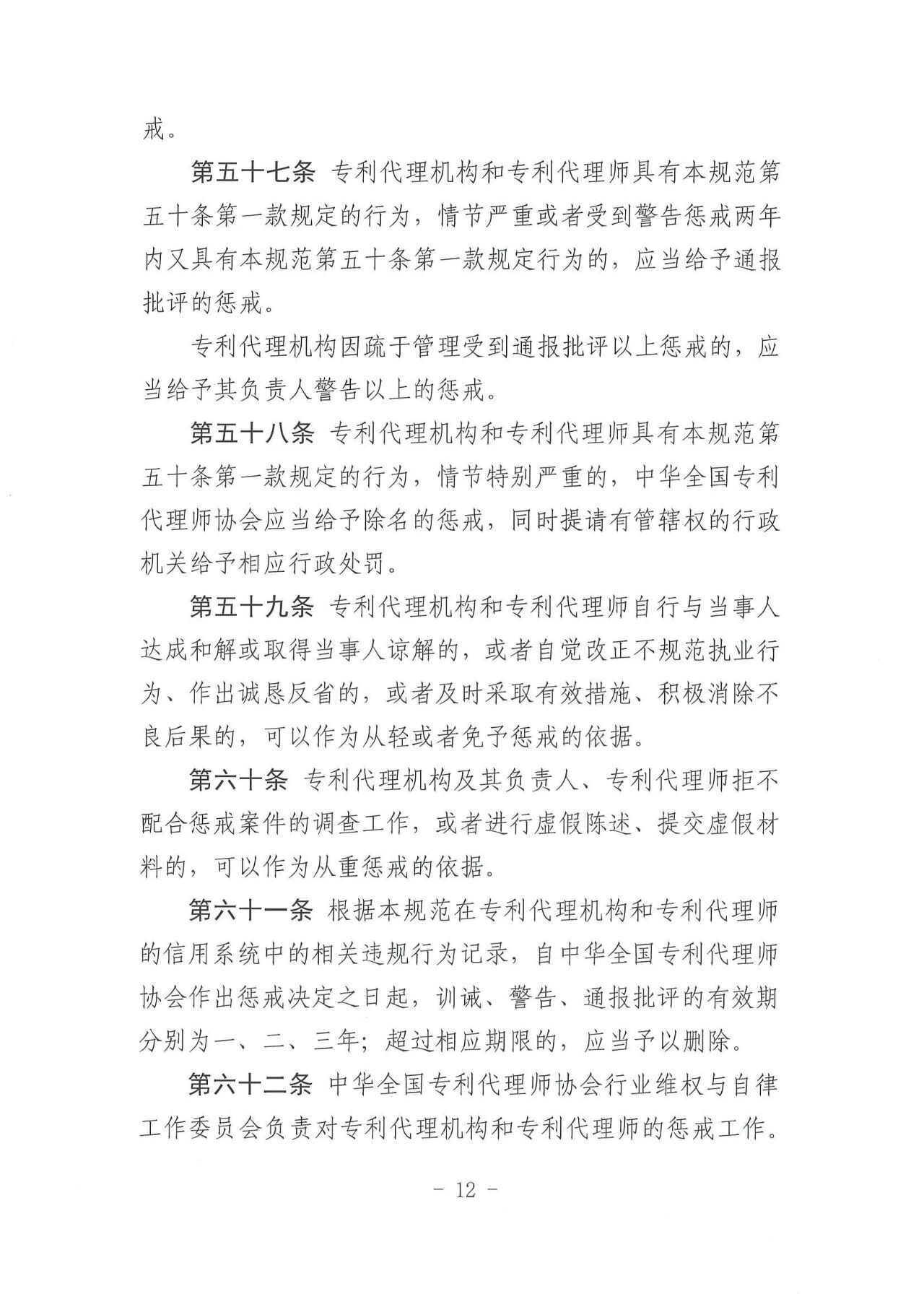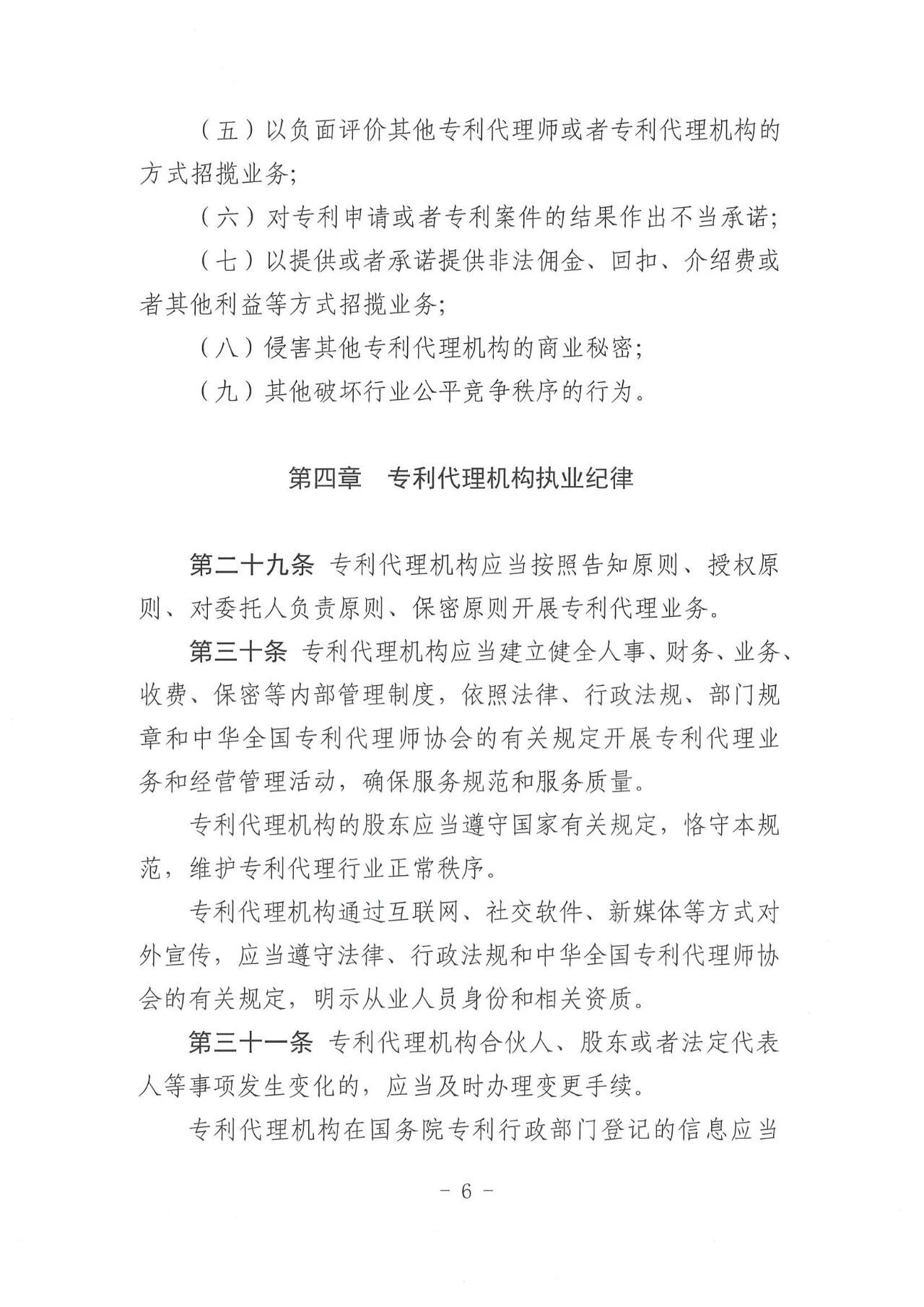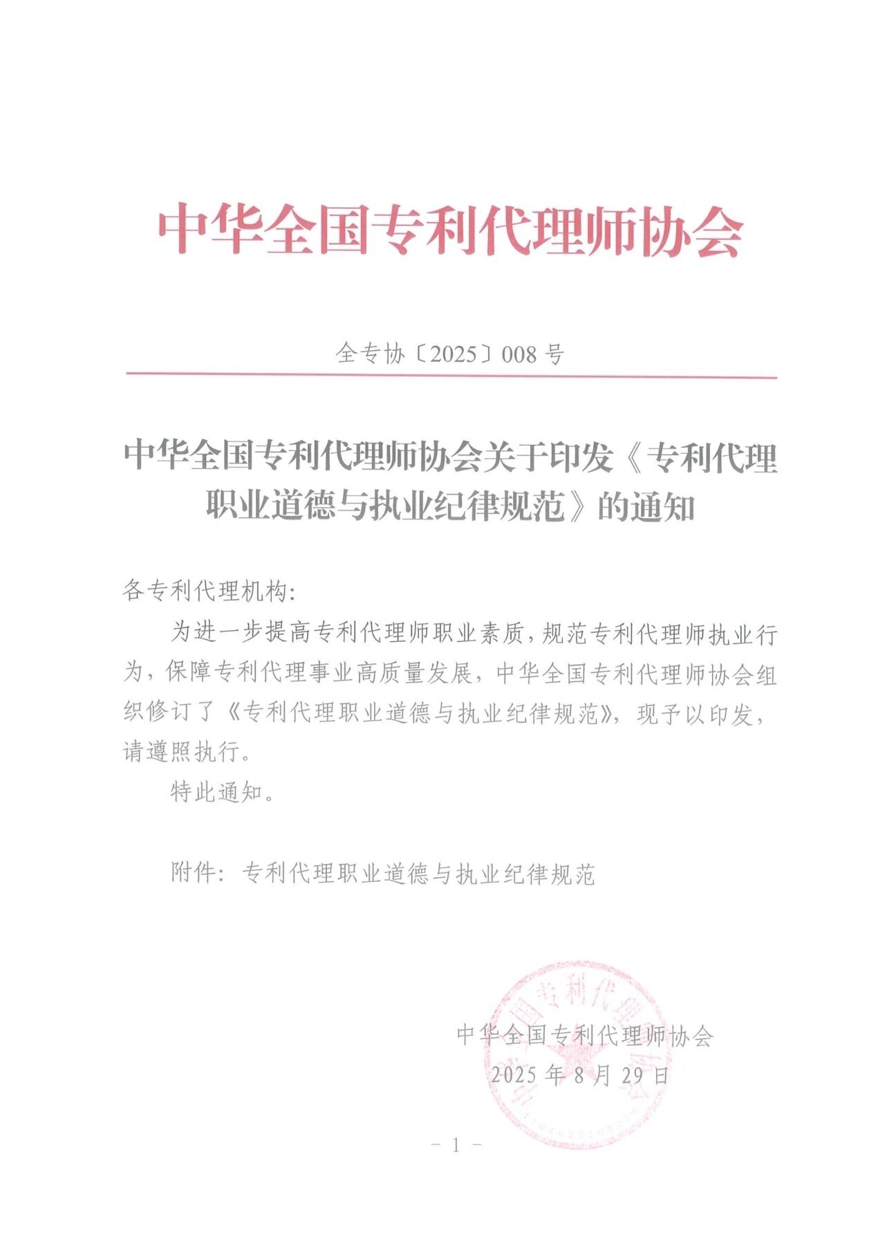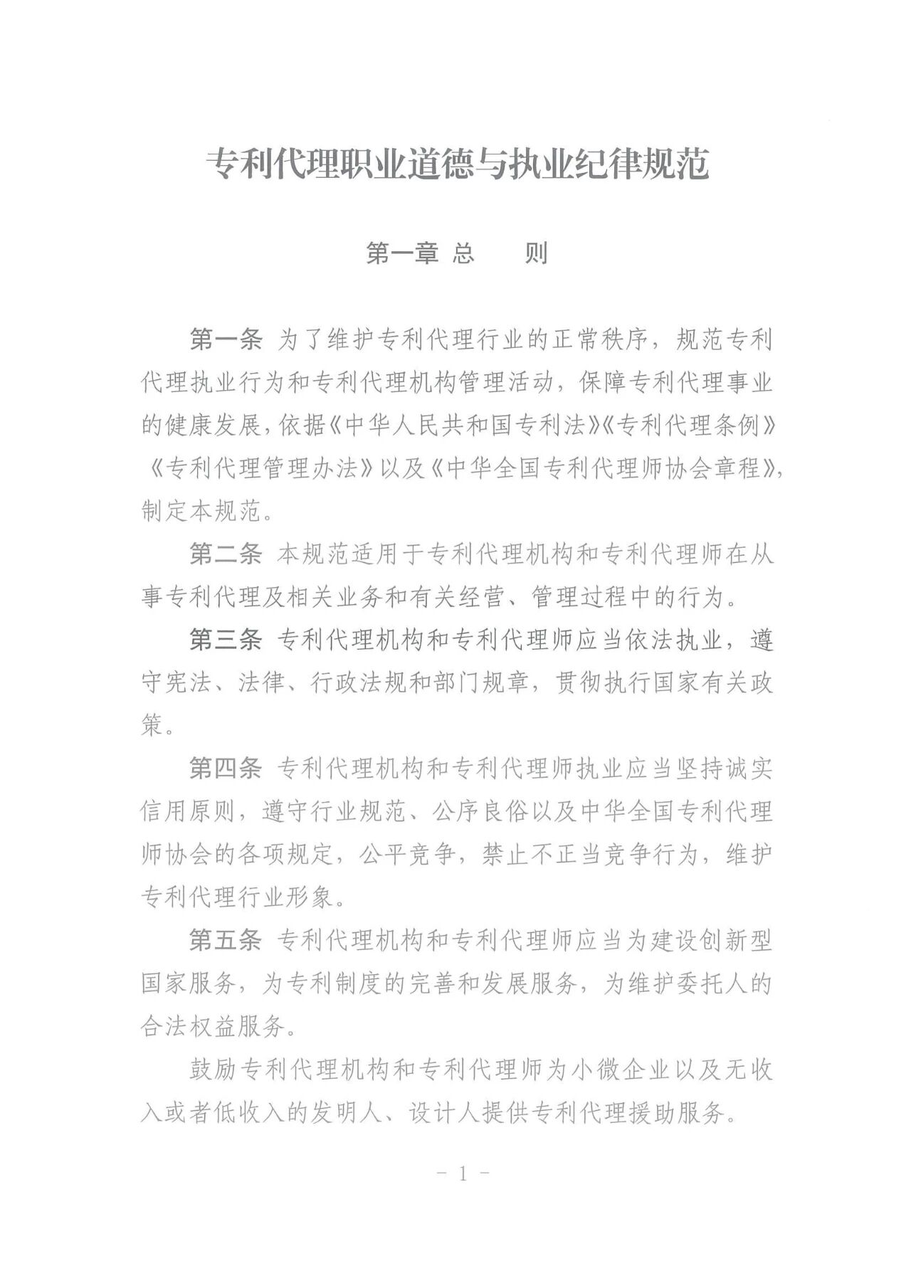 为进一步提高专利代理师职业素质,规范专利代理师执业行为,保障专利代理事业高质量发展,中华全国专利代理师协会组织修订了《专利代理职业道德与执业纪律规范》,现予以印发,请遵照执行。