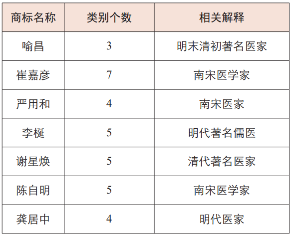 (三)法律依据:《商标法》第四条:自然人、法人或者其他组织在生产经营活动中,对其商品或者服务需要取得商标专用权的,应当向商标局申请商标注册。不以使用为目的的恶意商标注册申请,应当予以驳回。该项条款旨在规范商标申请注册的秩序,打击不以使用为目的、囤积商标注册申请的行为?!渡瘫晟蟛樯罄碇改稀分卸源私辛舜罅康那榭龇治鲇氚咐芯?#xff0c;其中涉及知名人物姓名的亦有相关解释:大量申请注册与知名人物姓名、知名作品或者角色名称等公共文化资源相同或者近似标志的,可构成《商标法》第四条所指的“不以使用为目的的恶意商标注册申请”的情形。例如江西某中医连锁管理有限公司于2020年12月10日提交了33件商标注册申请,指定使用在第3类(化妆品)、第44类(医疗诊所)等7个商品和服务项目上。经查询,该系列商标名称均在江西历史上十大名医姓名之列,具体情况如下表: