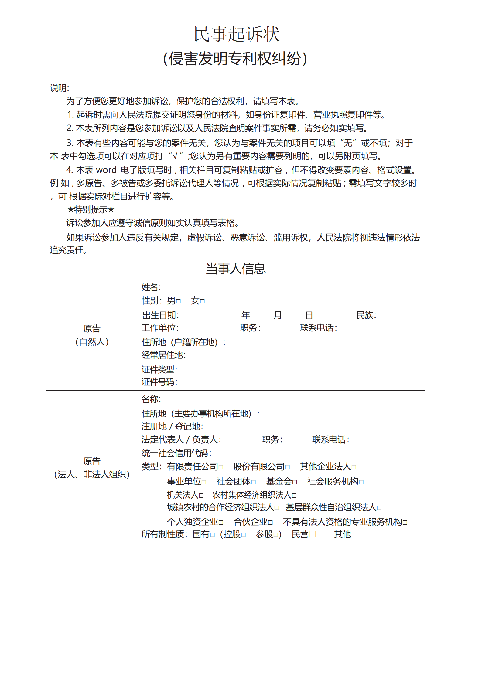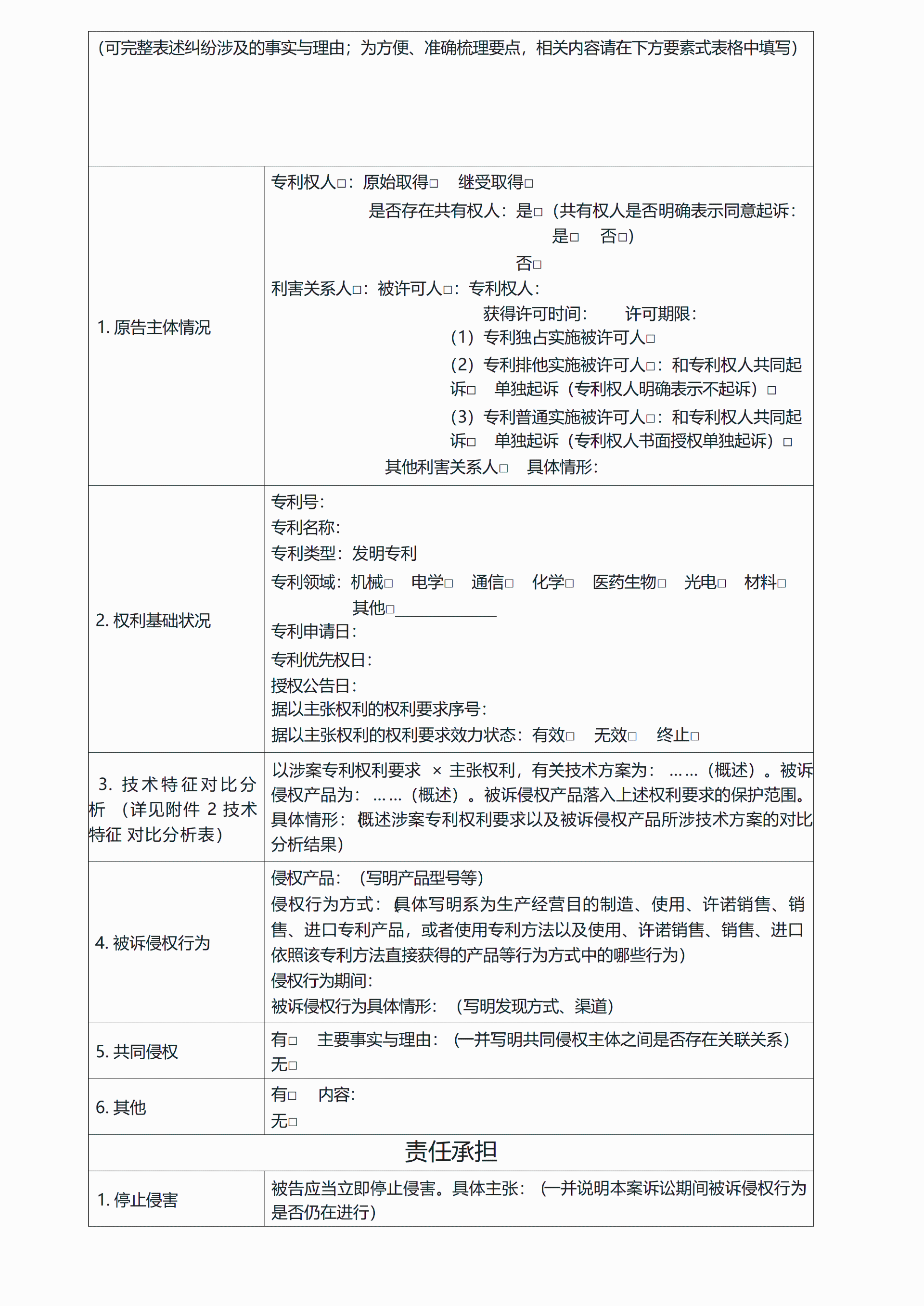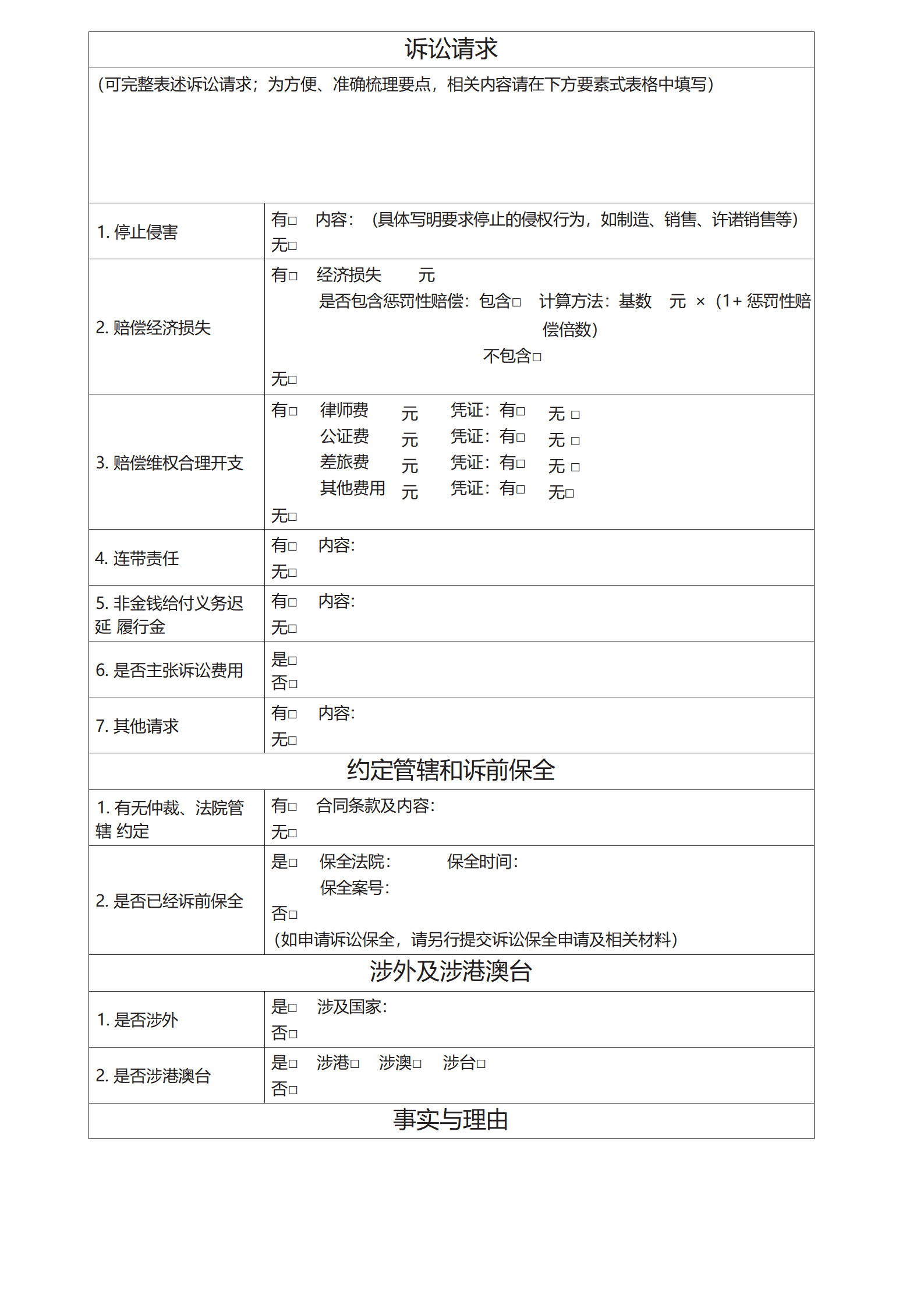 事实依据方面,示范文本根据侵害发明专利权纠纷诉请内容细化了六项内容,当事人逐项如实填写即可。