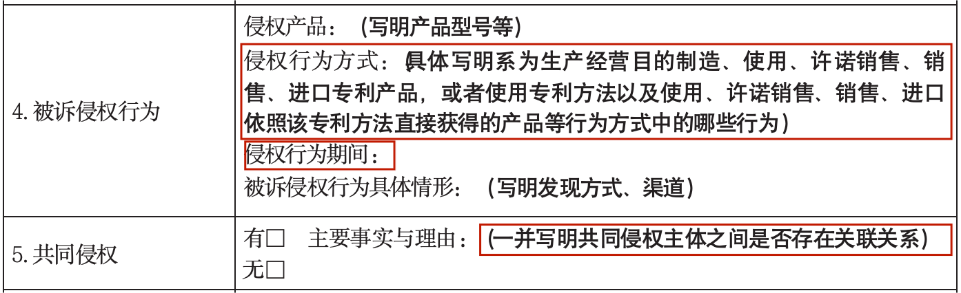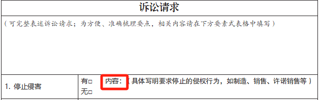 在填写第1项“停止侵害”时,需要写明要求各被告停止的具体侵权行为,如制造、销售、许诺销售等,同时需要写明案涉被诉侵权产品的名称、型号。