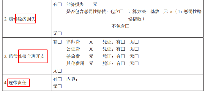 在填写第2项“赔偿经济损失”时,要注意写明经济损失的具体金额,如果包含惩罚性赔偿,需要列明惩罚性赔偿的基数和倍数。