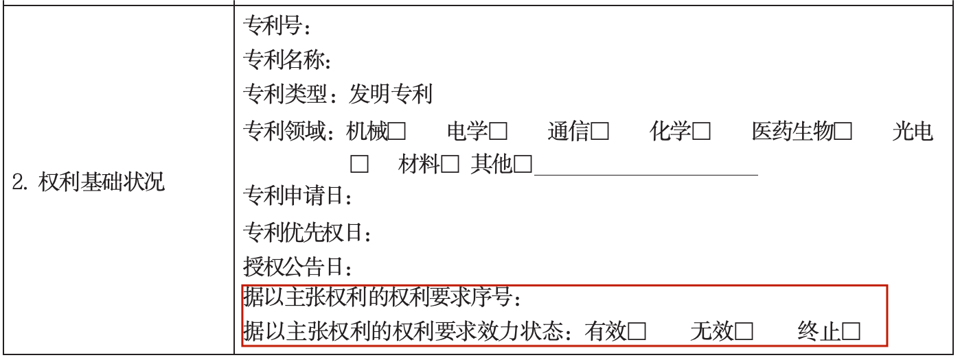 原告需完整准确地填写专利信息,包含专利号、专利名称、专利类型、专利领域等,还需明确据以主张权利的权利要求序号,并说明据以主张的权利要求的效力状态。